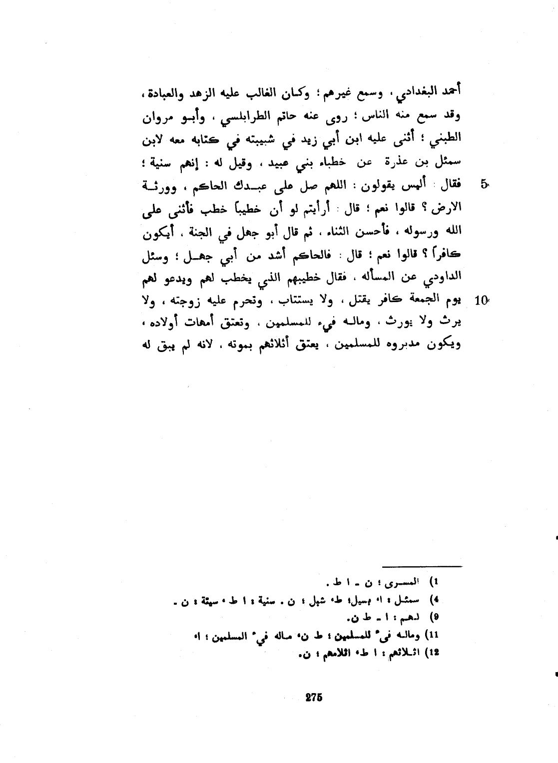أحمد البغدادي. وسمع غيرهم. وكان الغالب عليه الزهد والعبادة. وقد سمع منه الناس، روى عنه حاتم الطرابلسي، وأبو مروان الطلبني، وأثنى عليه ابن أبي زيد في شيبته، في كتابه منه، الى من سأل ابن عذرة عن خطباء بني عبيد. وقيل له: إنهم يثنون عليهم. قال: أليس يقولون: اللهم صل على عبدك الحاكم، وورّثه الأرض؟ قالوا: نعم. قال أرأيتم لو أن خطيباً خطب فأثنى على الله تعالى ورسوله، فأحسن الثناء، ثم قال: أبو جهل في الجنة، أيكون كافراً؟ قالوا: نعم. قال: فالحاكم أشر من أبي جهل. وسئل الداودي عن المسألة فقال: خطيبهم الذي يخطب لهم، يدعو يوم الجمعة. كافر يقتل. ولا يستتاب، وتحرم عليه زوجته، ولا يرث ولا يورث ماله في المسلمين. وتعتق أمهات أولاده، ويكون مدبروه للمسلمين. يعتق أثلاثهم، بموته، لأنه لم يبق له