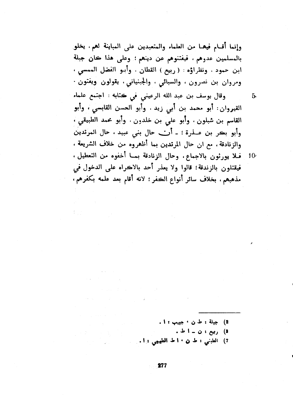 وإنما أقام من هنا من العلماء والمتعبدين على المباينة لهم، لئلا يخلو بالمسلمين عدوهم، فيفتنوهم عن دينهم. وعلى هذا كان حبيب بن حمدون ونظراؤه، القطّان، وأبو الفضل الممسي، ومروان بن نصرون والجبنياني والسبائي، وبه يقولون ويفتون. وقال أبو يوسف بن عبد الله الرعيني في كتابه: أجمع علماء القيروان أبو محمد، وأبو الحسن القابسي، وأبو القاسم ابن شبلون، وأبو علي بن خلدون، وأبو بكر الطبني، وأبو بكر بن عذرة: أن حال بني عبيد، حال المرتدين والزنادقة، بما أظهروه من خلاف الشريعة، فلا يورثون بالإجماع، وحال الزنادقة بما أخفوه من التعطيل. فيقتلون بالزندقة، قالوا: ولا يقدر أحد بالإكراه على الدخول في مذهبهم، بخلاف سائر أنواع الكفر. لأنه أقام بعد علمه بكفرهم،