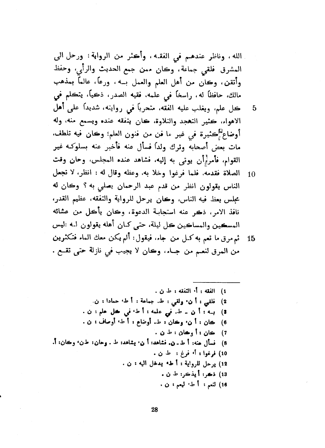 الله. وناظر عندهم في التفقه، وأكثر من الرواية. ورحل الى المشرق فلقي حماداً، وكان مَن جمع الحديث والرأي، وحفظ وأتقن. وكان من أهل العلم والعمل به. ورعاً عالماً بمذهب مالك. حافظاً له، راسخاً في علمه، فقيه الصدر ذكياً يتكلم في كل علم ويغلب عليه الفقه. متحريّاً في روايته، شديداً على أهل الأهواء، كثير التهجد والتلاوة. وكان يتفقه عنده، وسمع منه. وله أوضاع كثيرة في غير ما فن من فنون العلم وكان فيه تلطف. مات بعض أصحابه، وترك ولداً. فأخبر عنه بسلوكه غير القوام فأمر أن يؤتى به إليه، يشاهد عنده المجلس، وحان وقت الصلاة فقدمه، فلما فرغ وخلا به، وعظه وقال له: أنظر، لا تجعل الناس يقولون أنظر من قدم عبد الرحمن يصلي به. وكان له مجلس يعظ الناس فيه، وكان يرحل إليه للرواية والتفقه. عظيم القدر، ونافذ الأمر، يذكر عنه استجابة الدعوة. وكان يأكل من عشائه المساكين، كل ليلة. حتى كان أهله يقولون له: ليس ثم مرق ما يعم كل من جاء. فيقول: ألم يكن معك الماء؟ فكثري من المرق، ليعم من جاء. وكان لا يجيب في نازلة، حتى تقع.