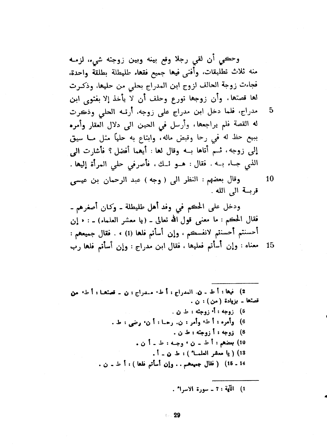 وحكى أنه لقي رجلاً وقع بينه وبين زوجته شيء لزمه فيه ثلاث تطليقات. وأفتى جميع الفقهاء بطليطلة، واحدة. فجاءت زوجة الحالف لزوج ابن مدارج بحلي من حليها. وذكرت لها من قصتها، وأن زوجها تورّع وحلف أن لا يأخذ إلا بفتوى ابن مدارج، فلما دخل ابن مدارج على زوجته، أرته الحلي وذكرت له القصة. فلم يراجعها وأرسل في الحين الى دلال العقار، وأمر ببيع حظٍ له في رحى، وقبض ماله، وابتاع حلياً مثل ما سيق الى زوجته، ثم أتاها وقال لها: أيهما أفضل؟ فأشارت الى الذي جابه. فقال: هو لك، واصرفي حلي المرأة إليها. وقال بعضهم: النظر الى عبد الرحمن بن عيسى، قربة الى الله عز وجلّ. ودخل على الحكم في وفد أهل طليطلة، وكان أصغرهم. فقال الحكم: ما معنى قول الله عز وجل، يا معشر العلماء: " إن أحسنتُم أسحنتم لأنفسكم، وإن أسأتُم فلَها ". رب