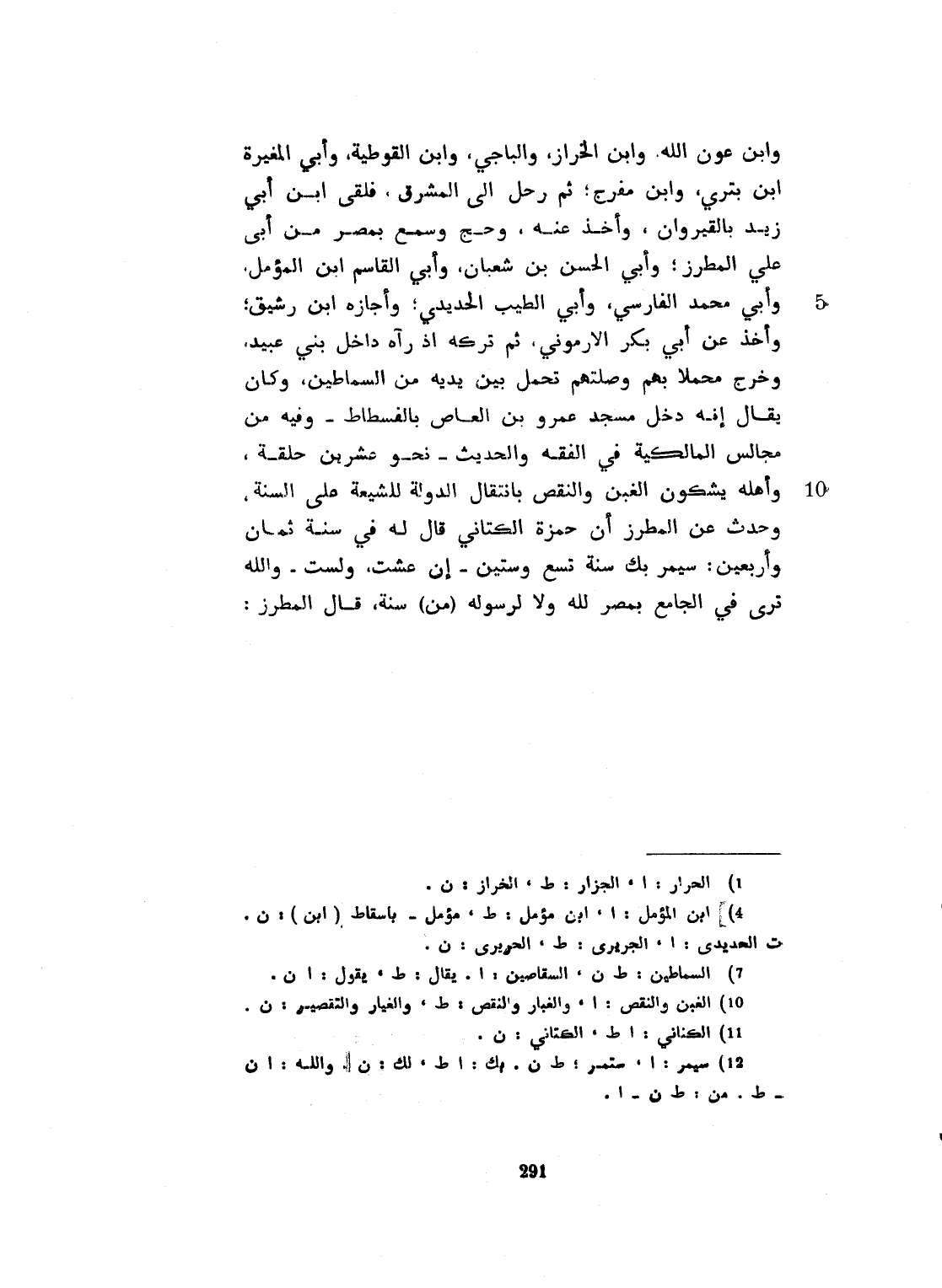 وابن عون الله، وابن الخراز والباجي، وابن القوطية، وأبي المغيرة ابن بتري، وابن مفرج. ثم رحل الى المشرق، فلقي ابن أبي زيد بالقيروان، وأخذ عنه، وحجّ وسع بمصر، من أبي علي المطرزي، وأبي الحسن ابن شعبان، وأبي القاسم ابن المؤمل، وأبي محمد الفاسي، وأبي الطيب الحريري، وأجازه ابن رشيق. وأخذ عن أبي بكر الأرموني، ثم تركه، إذ رآه داخل بني عبيد. وخرج محملاً بهم، فحمل بين يديه بين السماطين، وكان يقول: إنه دخل مسجد عمرو بن العاص بالفسطاط. وفيه من مجالس المالكية في الفقه، والحديث نحو عشرين حلقة. وأهله يشكون لقياه والنقص بانتقال الدولة للشيعة على السنة. وحدث أبو علي المطرزي أن حمزة الكناني، قال له في سنة ثمان وأربعماية: سيمر بك سنة تسع وستين إن عشت، ولست والله ترى في الجامع من ينصر الله، ولا رسول من سنة. قال المطرزي: