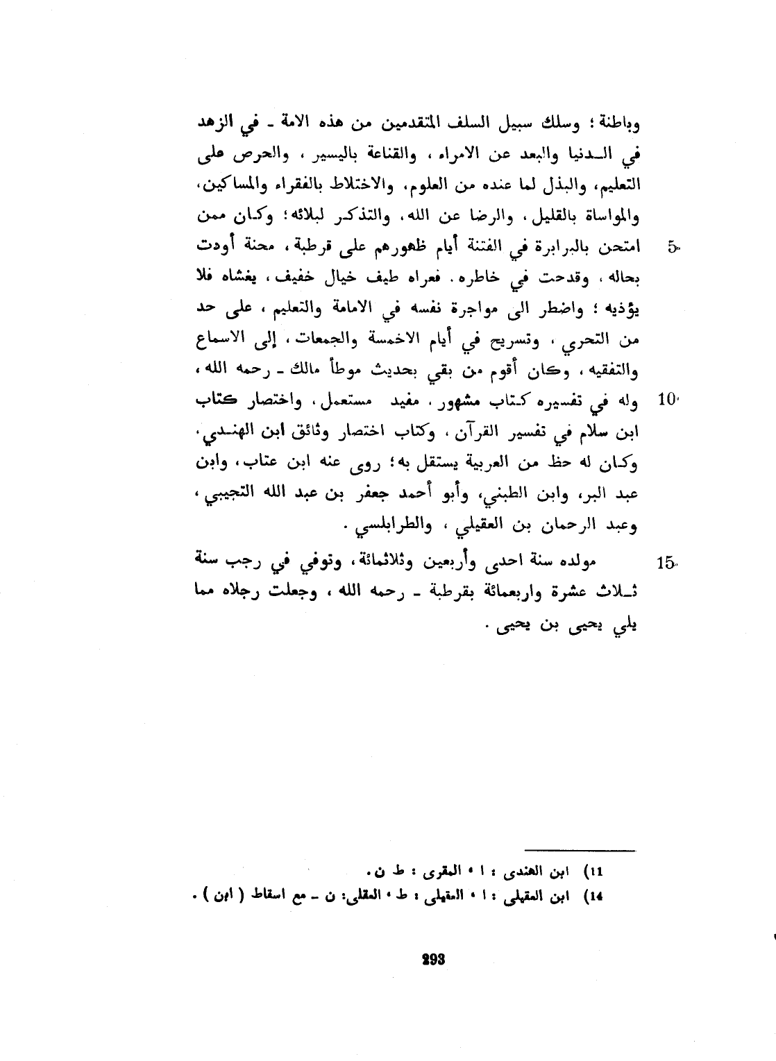 وباطنه. وسلك سبيل السلف المتقدمين من هذه الأمة في الزهد في الدنيا، والبعد عن الأمراء والقناعة باليسير، والحرص على التعليم والرضى عن الله، والتذكر لبلائه. وكان ممن امتحن بالبرابرة في الفتنة، أيام ظهورهم على قرطبة. محنة أودت بحاله، وقدحت في خاطره. فعراه طيف خيال خفيف، يغشاه فلا يؤذيه، واضطر الى مؤاجرة نفسه في الإمامة والتعليم على حد من التحري. وتسرح في أيام الأخمسة والجمعات، الى الإسماع والتفقه. وكان أقوم من بقي بحديث موطأ مالك رحمه الله، وله في تفسيره كتاب مشهور، مفيد مستعمل، واختصار كتاب ابن سلام في تفسير القرآن، وكتاب اختصار وثائق ابن الهندي. وكان له حظ من علم العربية، يستقل به. روى عنه ابن عتاب، وابن عبد البر، وابن الطبني، وأبو أحمد جعفر ابن عبد الله التجيبي، وعبد الرحمن القلعي، والطرابلسي. مولده سنة إحدى وأربعين وثلاثماية. وتوفي في رجب سنة ثلاث عشرة وأربعماية بقرطبة. رحمه الله. وجعلت رجلاه مما يلي يحيى بن يحيى.