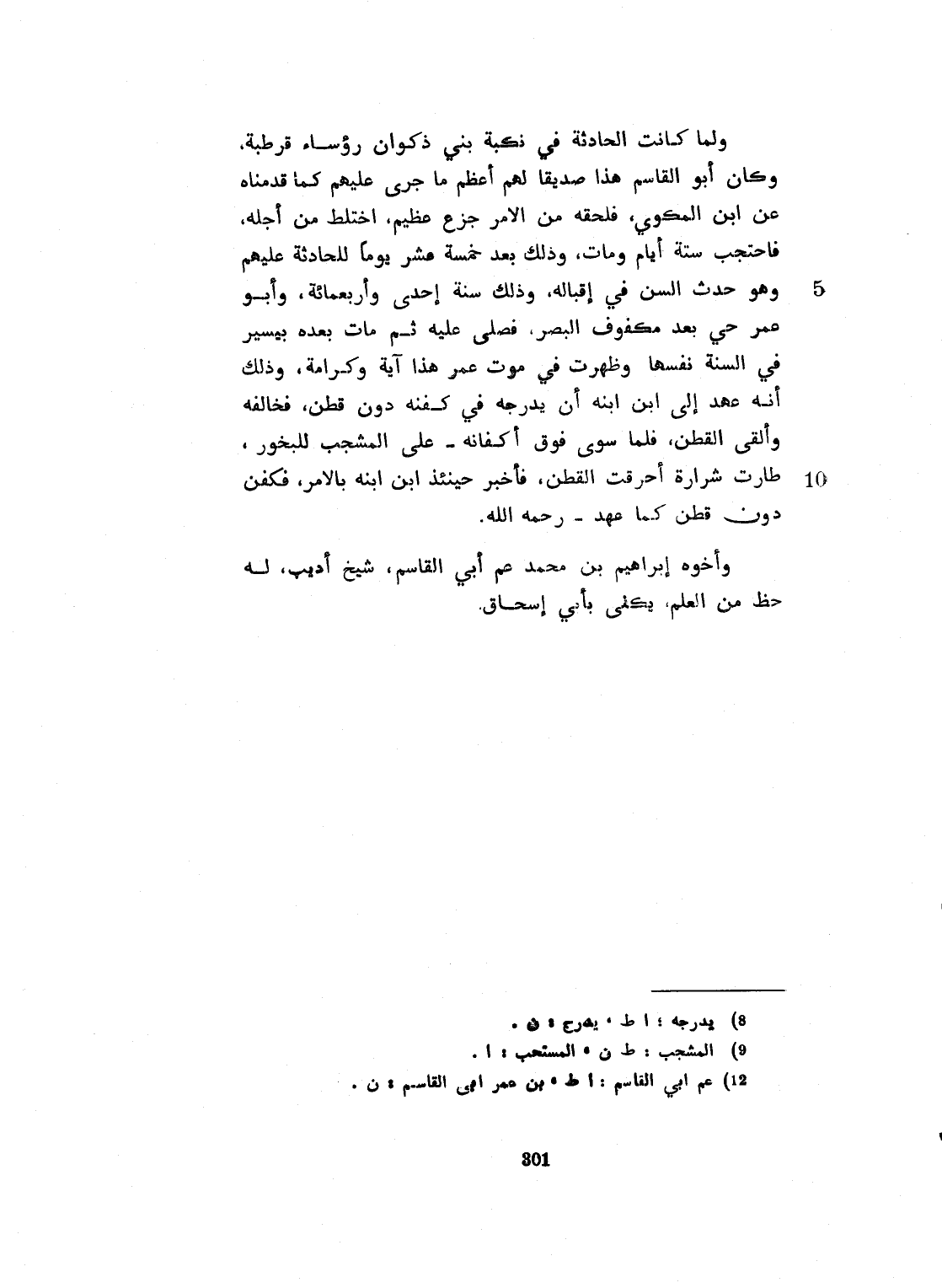 ولما كانت الحادثة في نكبة بني ذكوان، رؤساء قرطبة. وكان أبو القاسم هذا صديقاً لهم، أعظم ما جرى عليهم كما قدمناه عن ابن المكوى. فلحقه من الأمر جزع عظيم، اختلط من أجله، فاحتجب ستة أيام. وذلك سنة إحدى وأربعماية. وأبوه عم حي بعد، مكفوف البصر، فصلى عليه ثم مات بعده بيسير، في السنة نفسها. وظهرت في موت عمر هذا آية وكرامة، وذلك أنه عهد الى ابنه أن يدرجه في كفنه، دون قطن، فخالفه وألقى القطن. فلما سوي فوق أكفانه على المشجب للبخور طارت شرارة، أحرقت القطن فأخبر حينئذ ابن ابنه بالأمر. فكفن دون قطن. كما عهد رحمهم الله. وأخوه ابراهيم بن محمد عم أبي القاسم، شيخ أديب له حظ من العلم. يكنى بأبي إسحاق، رحمه الله.