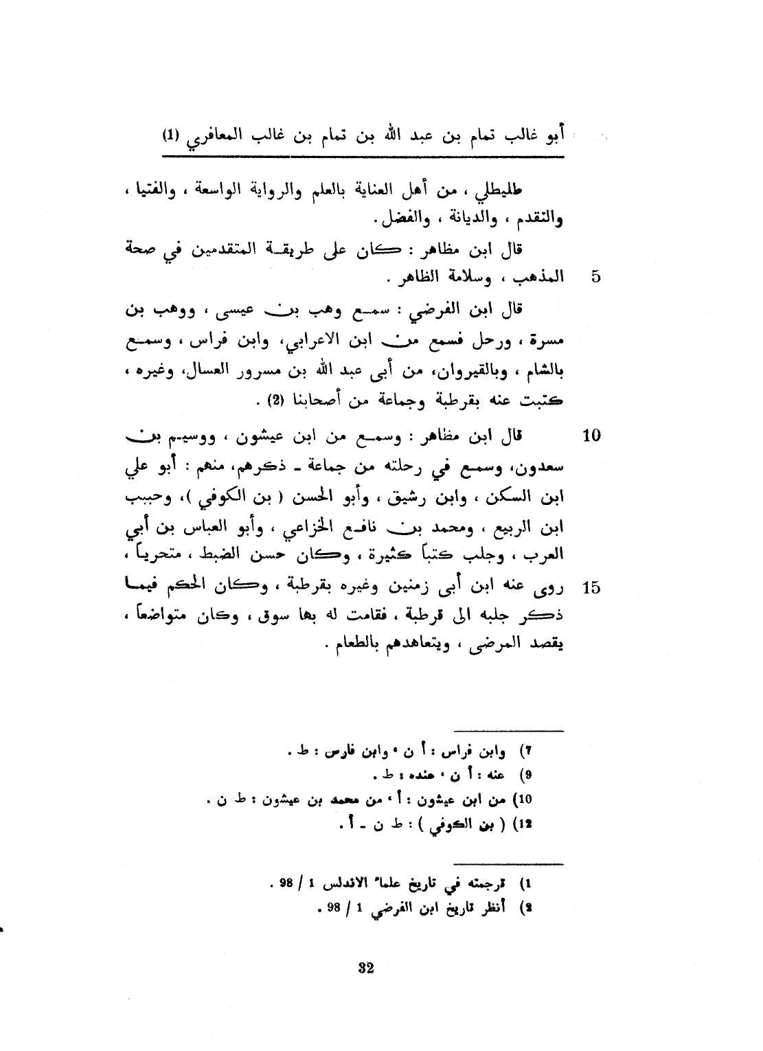 طليطلي من أهل العناية بالعلم، والرواية الواسعة، والفتيا، والتقدم والديانة والعقل. قال ابن مظاهر: كان على طريقة المتقدمين في صحة المذهب، وسلامة الظاهر، قال ابن الفرضي: سمع وهب بن عيسى ووهب بن مسرة، ورحل فسمع من ابن الأعرابي، وابن فراس، وسمع بالشام وبالقيروان من أبي عبد الله بن مسرور الغسال، وغيره. كتبت عنه بقرطبة وجماعة من أصحابنا. قال ابن مظاهر: وسمع من محمد بن عيشون، ووسيم بن سعدون، وسمع في رحلته من جماعة ذكرهم، منهم: أبو علي ابن السكن، وابن رشيق، وأبو الحسن ابن الكوفي، وحبيب ابن الربيع، ومحمد بن نافع الخزاعي، وأبو العباس ابن أبي العرب، وجلب كتباً كثيرة. وكان حسن الضبط متحرياً. روى عنه ابن أبي زمنين، وغيره، بقرطبة. وكان الحكم قد جلبه الى قرطبة، فقامت له بها سوق. وكان متواضعاً يعود المرضى، ويتعاهدهم بالطعام.