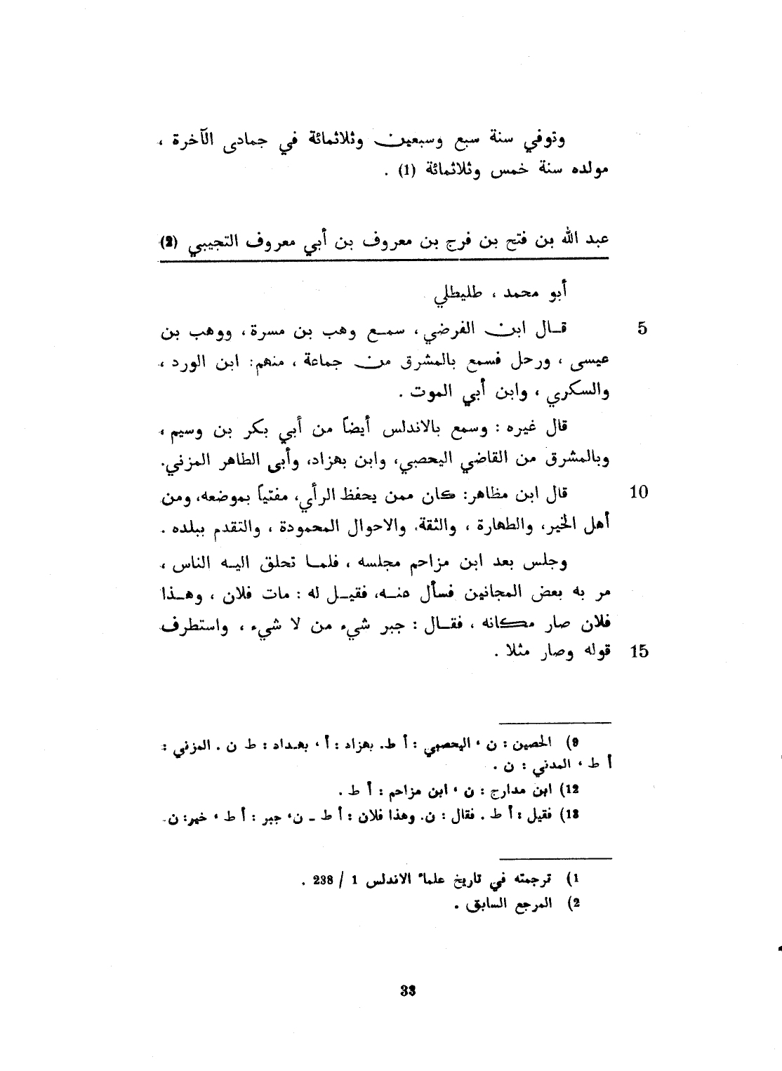أبو محمد. طليطلي. قال ابن الفرضي، سمع وهب بن مسرة، ووهب بن عيسى، ورحل فسمع بالمضرق من جماعة، منهم: ابن الورد والسكري، وابن أبي الموت. قال غيره: وسمع بالأندلس أيضاً من أبي بكر بن وسيم، وبالمشرق من القاضي الحصين، وابن بهزاد، وأبي الطاهر المدني. كان ممن يحفظ الرأي، مفتياً بموضعه. ومن أهل الخير والطهارة والثقة، والأحوال المحمودة والتقدم ببلده. وجلس بعد ابن مدارج بمجلسه، فلما تحلق إليه الناس مرّ به بعض المجانين فسأل عنه: فقيل: مات فلان، وهذا فلان صار مكانه. فقال خير شيء، من لا شيء. واستظرف قوله، وصار مثلاً.