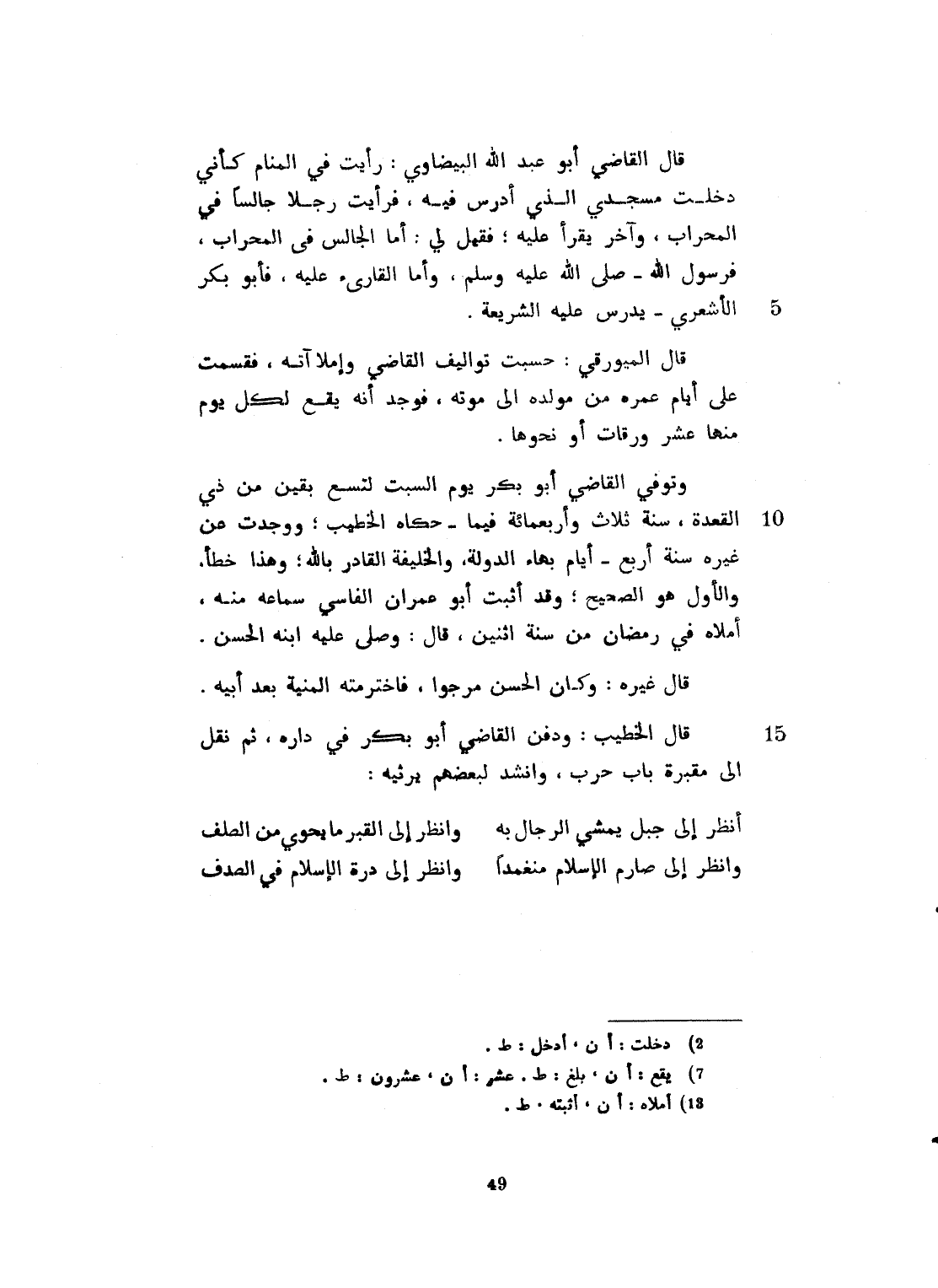 قال القاضي أبو عبيد الله البيضاوي: رأيت في المنام: كأني دخلت مسجدي الذي أدرس فيه، فرأيت رجلاً جالساً في المحراب، وآخر يقرأ عليه. فقيل لي أما الجالس في المحراب، فرسول الله، صلى الله عليه وسلم. وأما القارئ: فأبو بكر الأشعري، يدرس عليه الشريعة. قال الميورقي: حسبت تواليف القاضي، وإملاءاته، فسمت على أيام عمره، من مولده الى موته. فوجد أنه يقع لكل يوم منه عشرون. قلت: أو نحوها. وتوفي القاضي أبو بكر يوم الست، لتسع بقين من ذي القعدة، سنة ثلاث وأربعماية، فيما حكاه الخطيب، ووجدت عن غيره: سنة أربع. أيام بهاء الدولة، والخليفة القادر بالله. وهذا خطأ. والأول هو الصحيح. وقد أثبت أبو عمران الفاسي سماعه منه إملاء، في رمضان من سنة اثنتين. قال: وصلى عليه ابنه الحسن. قال غيره: وكان الحسن مرجواً فاخترمته المنية، بعد أبيه. قال الخطيب: ودفن القاضي أبو بكر في داره، ثم نقل الى مقبرة باب حرب. وأنشد بعضهم يرثيه:
