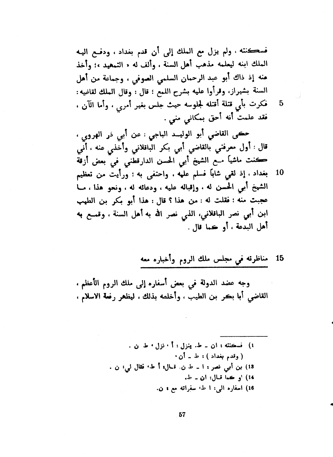 فسكنته. ولم يزل مع الملك الى أن قدم بغداد، ودفع إليه الملك ابنه، يعلمه مذهب أهل السنة. وألّف له التمهيد. وأخذ عنه إذ ذاك، أبو عبد الرحمن السلمي الصوفي، وجماعة من أهل السنّة، بشيراز. وقرأوا عليه شرح اللمع، قال، وقال الملك لقاضيه: فكرت بأي قتلة أقتله، بجلوسه حيث جلس بغير أمري. وأما الآن، فقد علمت أنه أحق بمكاني مني. وحكى القاضي أبو الوليد الباجي عن أبي ذر الهروي، قال: أول معرفتي بالقاضي أبي بكر، وأخذي عنه، أني كنت ماشياً مع الشيخ أبي الحسن الدارقطني، في بعض أزقة بغداد، إذ لقي شاباً فسلم عليه، واحتفل به. ورأيت من تعظيم الشيخ أبي الحسن له، وإقباله عليه ودعائه له ونحو هذا، ما عجبت منه. فقلت له: من هذا؟ فقال لي: هذا أبو بكر ابن الطيب، الذي نصر الله به أهل السنّة. وقمع به أهل البدعة. أو كما قال.