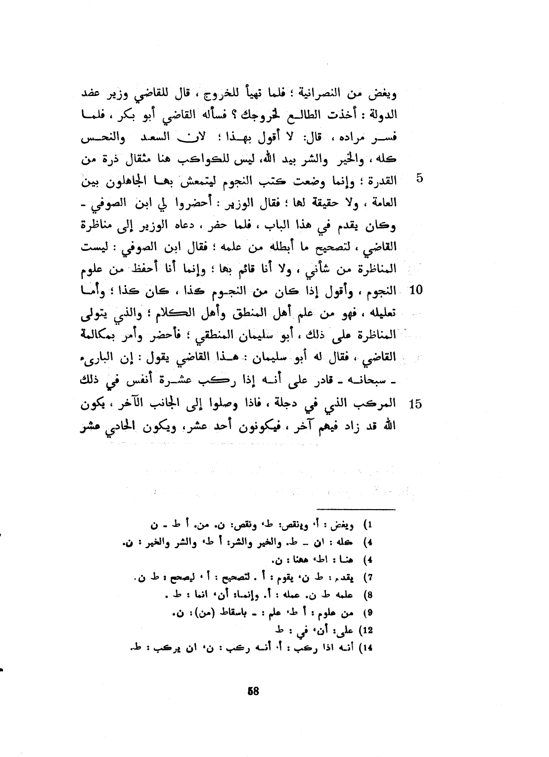 ويغض من النصرانية. فلما تهيأ للخروج، قال للقاضي، وزير عضد الدولة: الطالع خروجاً؟ فسأله القاضي أبو بكر. فلما فسر مراده، قال: لا أقول بهذا. لأن السعد والنحس كله، والشر والخير كله، بيد الله عز وجلّ. ليس للكواكب هاهنا مثقال ذرة من القدرة. وإنما وضعت كتب المنجمين ليتمعش بها الجاهلون، بين العامة. ولا حقيقة لها. فقال الوزير: احضروا لي ابن الصدفي، ليست المناظرة من شأني. ولا أنا قائم بها، وإنما أنا أحفظ علم النجوم، وأقول إذا كان من النجوم كذا كان كذا. وأما تعليله، فهو من علم المنطق. فأحضر وأم بمكالمة القاضي، فقال له أبو سليمان: هذا القاضي يقول: إن الباري سبحانه، قادر على أن يركب عشرة أنفس في ذلك المركب الذي في دجلة، فإذا وصلوا الى الجانب الآخر يكون الله قد زاد فيهم آخر فيكونون أحد عشر. ويكون الحادي عشر