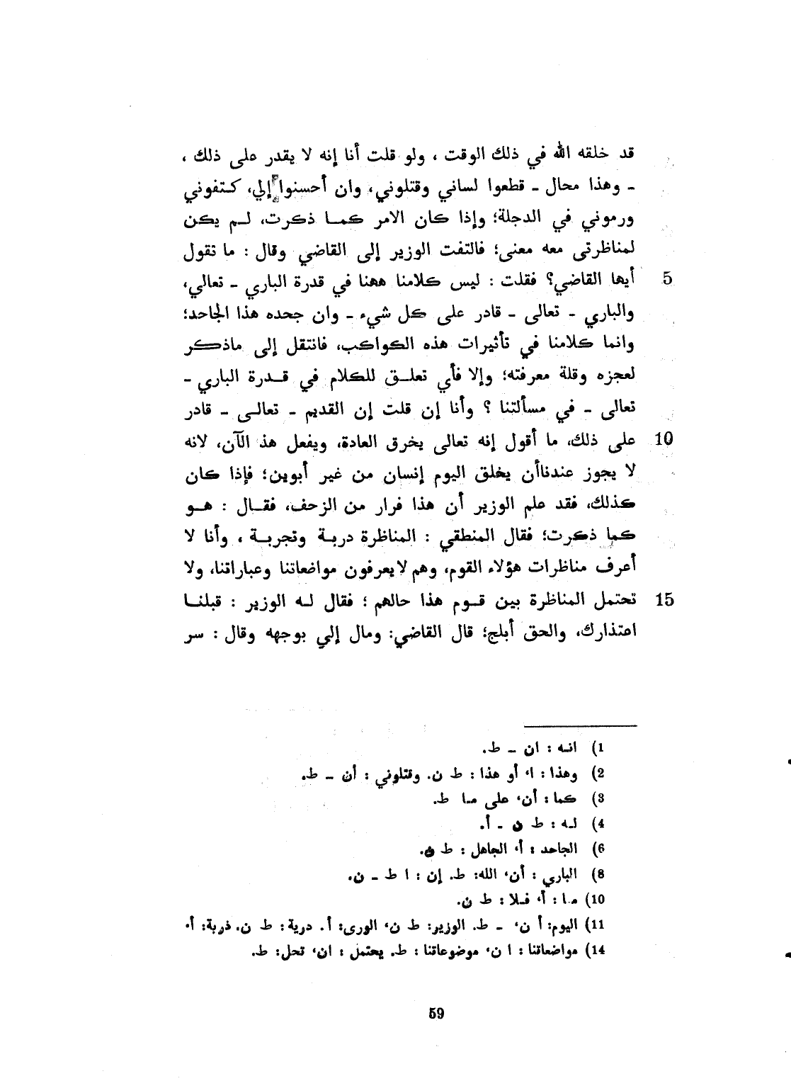 من خلقه الله في ذلك الوقت. ولو قلت أنا لا يقدر على ذلك أو هذا محال، قطعوا لساني وقتلوني، وإن أحسنوا إليّ كتفوني، ورموني في الدجلة. وإذا كان الأمر كما ذكرت لم يكن لمناظرتي معه معنى. فالتفت الوزير الى القاضي وقال: ما تقول أيها القاضي؟ فقلت: ليس كلامنا هاهنا في قدرة الباري تعالى، والباري تعالى قادر على كل شيء. وإن جحده هذا الجاهل، وإنما كلامنا في تأثيرات هذه الكوامب، فانتقل الى ما ذكر لعجزه وقلة معرفته، وإلا فأي تعلق للكلام في قدرة الباري، عز وجلّ، في مسألتنا؟ وأنا وإن قلت إن القديم تعالى قادر على ذلم، ما أقول إنه يخرق العادة، وبفعل هذا. لأنه لا يجوز عندنا أن يخلق اليوم إنساناً من غير أبوين، فإذا كان كذلك فقد علم الوزير أن هذا فرار من الزحف. فقال هو كما ذكرت. فقال المنطيقي: المناظرات دربة وتجربة، وأنا لا أعرف مناظرات هؤلاء القوم، وهم لا يعرفون مواضعتنا وعبارتنا، ولا تجمل المناظرة بين قم هذا حالهم. فقال له الوزير: قبلنا اعتذارك والحق أبلج. قال القاضي: ومال إليّ بوجهه، وقال: سر