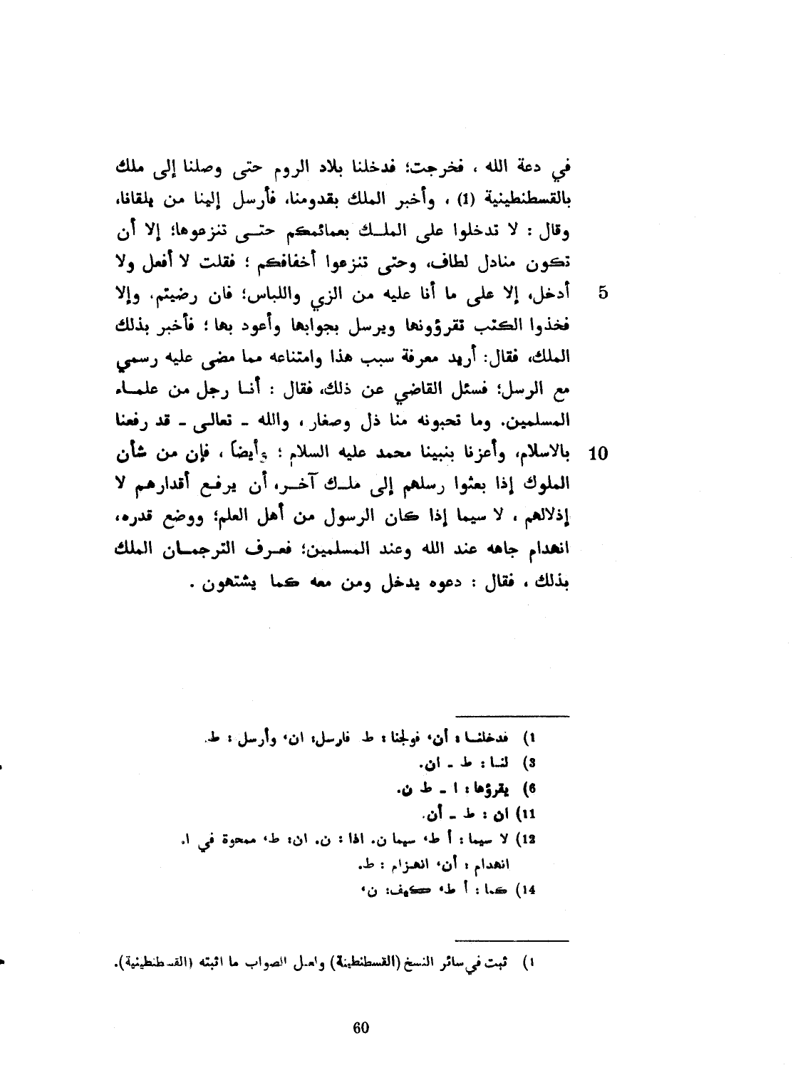 في دعة الله. فخرجت. فدخلنا بلاد الروم، حتى وصلت الى ملك الروم بالقسطنطينية، وأخبر الملك بقدومنا. فأرسل إلينا من تلقانا، وقال: لا تدخلوا على الملك بعمائمكم، حتى تنزعوها. إلا أن تكون مناديل لطاف، وحتى تنزعوا أخفافكم. فقلت: لا أفعل، ولا أدخل، إلا بما أنا عليه من الزي، واللباس. فإن رضيتم، وإلا فخذوا الكتب تقرأونها، وأرسلوا بجوابها وأعود به. فأخبر بذلك المل، فقال: أريد معرفة سبب هذا وامتناعه عما مضى عليه رسمي مع الرسل. فسئل القاضي عن ذلك. فقال: أنا رجل من علماء المسلمين، وما تحبونه ما ذلّ وصغار، والله تعالى قد رفعنا بالإسلام وأعزّنا بنبينا محمد صلى الله عليه وسلم. وأيضاً فإن من شأن الملوك، إذا بعثوا رسلهم الى ملك آخر، رفع أقدارهم، لا إذلالهم. سيما إذا كان الرسول من أهل العلم. ووضع قدره انهدام جانبه، عند الله تعالى، وعند المسلمين. فعرّف الترجمان الملك بذلك، فقال: دعوه يدخل ومن معه كما يشاؤون.
