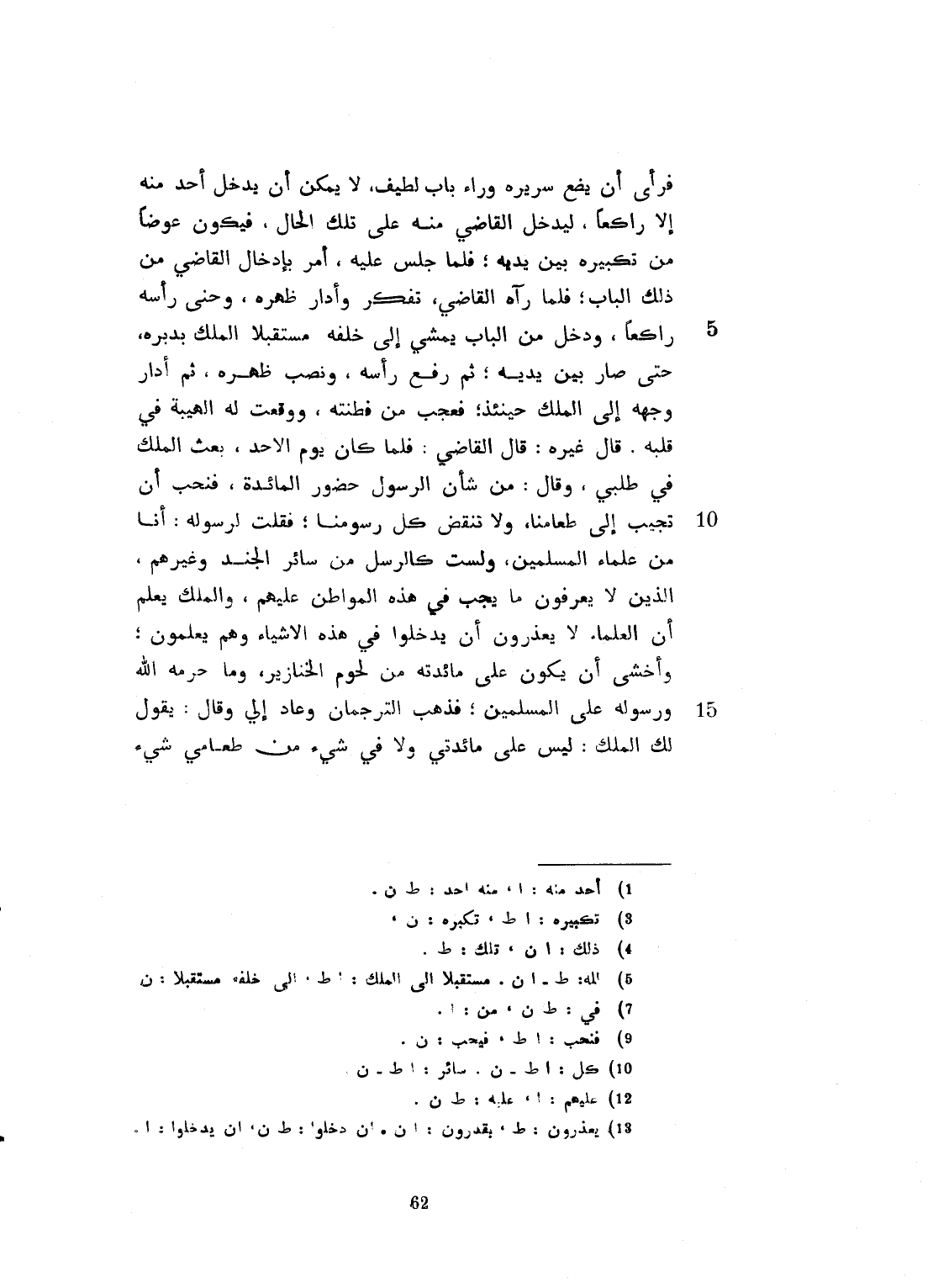 يديه. ثم رفع رأسه، ونصب ظهره. ثم أدار وجهه الى الملك حينئذ، فعجب من فطنته، ووقعت له الهيبة في قلبه. قال غيره: قال القاضي: فلما كان يوم الأحد، بعث الملك في طلبي، وقال: من شأن الرسول حضور مائدة الملك. فنحب أن تجيب الى طعامنا ولا تنقض كل رسومنا. فقلت لرسوله: أنا من علماء المسلمين، ولست كالرسل من الجند وغيرهم، الذين لا يعرفون ما يجب عليهم في هذا الموطن. والملك يعلم أن العلماء لا يقدرون أن يدخلوا هذه الأشياء، وهم يعلمون، وأخشى أن يكون على مائدته من لحوم الخنازير، وما حرمه الله تعالى على رسوله، وعلى المسلمين؟ فذهب الترجمان، وعاد إليّ وقال: يقول لك الملك: ليس على مائدتي، ولا في طعامي شيء تكرهه. وقد استحسنت ما أتيت به، وما أنت عندنا كسائر الرسل، بل أعظم، وما كرهت من لحوم الخنزير، إنما هو خارج من حضرتي بيني وبينه حجاب. فنهضت على كل حال. وجلست وقدّم الطعام، ومددت يدي وأوهمت الأكل، ولم آكل منه شيئاً مع أني لم أرَ على مائدته ما يكره. فلما فرغ من الطعام، بخّر المجلس وعطّره، ثم قال: هذا الذي تدعونه في معجزات نبيّكم من انشقاق القمر، كيف هو عندكم؟ قلت: هو صحيح عندنا، وانشقّ القمر على عهد رسول الله صلى الله عليه وسلم، حتى رأى الناس ذلك. وإنما رآه الحضور، ومن اتفق نظره إليه في تلك الحال. فقال الملك: وكيف لم يره جميع الناس؟ قلت: لأن الناس لم يكونوا على أهبة ووعد لشقوقه وحضوره. فقال: وهذا القمر بينكم وبينه نسبة وقرابة؟ لأي شيء لم تعرفه الروم وغيرها من سائر الناس، وإنما رأيتموه أنتم خاصة؟ قلت: فهذه المائدة بينكم وبينها نسبة؟ وأنتم رأيتموها دون اليهود، والمجوس والبراهمة، وأهل الإلحاد، وخاصة يونان جيرانكم، فإنهم كلهم منكرون لهذا الشأن، وأنتم رأيتموها دون غيركم. فتحيّر الملك وقال بكلامه: سبحان الله، وأمر بإحضار فلان القسيس ليكلمني. وقال: نحن لا نطيقه. لأن صاحبه قال: ما في مملكتي مثله، ولا للمسلمين في عصره مثله. فلم أشعر إذ جاؤوا برجل كالذئب أشقر الشعر مسبله، فقعد، وحكيت له المسألة فقال: الذي قاله المسلم لازم، هو الحق لا أعرف له جواباً إلا ما ذكره. فقلت له: أتقول إن الكسوف إذا كان، يراه جميع أهل الأرض أم يراه أهل الإقليم الذي بمحاذاته؟ قال: لا يراه إلا من كان في محاذاته. قلت: فما أنكرت من انشقاق القمر، إذا كان في ناحية لا يراه إلا أهل تلك الناحية، ومن تأهب للنظر له؟ فأما من أعرض عنه، وكان في الأمكنة التي لا يرى القمر منها فلا يراه. فقال: هو كما قلت. ما يدفعك عنه دافع. وإنما الكلام في الرواة الذين نقلوه. وأما الطعن في غير هذا الوجه، فليس بصحيح. فقال الملك: وكيف يطعن في النقلة؟ فقال النصراني: شبه هذا من الآيات، إذا صح، وجب أن ينقله الجم الغفير، الى الجم الغفير، حتى يتصل بنا العلم الضروري به، ولو كان كذلك، لوقع إلينا العلم الضروري به. فلما لم يقع لنا العلم الضروري به، دلّ أن الخبر مفتعل باطل. فالتفت الملك إليّ وقال: الجواب. قلت: يلزمه في نزول المائدة، ما يلزمني في انشقاق القمر، ويقال له لو كان نزول المائدة صحيحاً، لوجب أن ينقله العدد الكثير، فلا يبقى يهودي ولا نصراني ولا ثنوي إلا ويعلم هذا بالضرورة. ولما لم يعلموا ذلك بالضرورة، دلّ أن الخبر كذب. فبهت النصراني والملك، ومن ضمه المجلس. وانفض المجلس على هذا. يديه. ثم رفع رأسه، ونصب ظهره. ثم أدار وجهه الى الملك حينئذ، فعجب من فطنته، ووقعت له الهيبة في قلبه. قال غيره: قال القاضي: فلما كان يوم الأحد، بعث الملك في طلبي، وقال: من شأن الرسول حضور مائدة الملك. فنحب أن تجيب الى طعامنا ولا تنقض كل رسومنا. فقلت لرسوله: أنا من علماء المسلمين، ولست كالرسل من الجند وغيرهم، الذين لا يعرفون ما يجب عليهم في هذا الموطن. والملك يعلم أن العلماء لا يقدرون أن يدخلوا هذه الأشياء، وهم يعلمون، وأخشى أن يكون على مائدته من لحوم الخنازير، وما حرمه الله تعالى على رسوله، وعلى المسلمين؟ فذهب الترجمان، وعاد إليّ وقال: يقول لك الملك: ليس على مائدتي، ولا في طعامي شيء