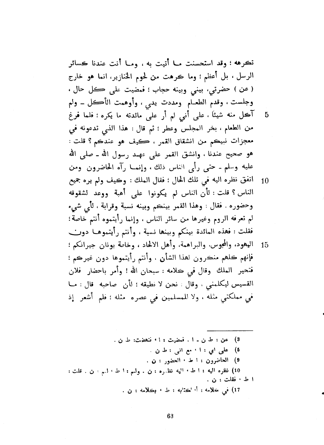تكرهه. وقد استحسنت ما أتيت به، وما أنت عندنا كسائر الرسل، بل أعظم، وما كرهت من لحوم الخنزير، إنما هو خارج من حضرتي بيني وبينه حجاب. فنهضت على كل حال. وجلست وقدّم الطعام، ومددت يدي وأوهمت الأكل، ولم آكل منه شيئاً مع أني لم أرَ على مائدته ما يكره. فلما فرغ من الطعام، بخّر المجلس وعطّره، ثم قال: هذا الذي تدعونه في معجزات نبيّكم من انشقاق القمر، كيف هو عندكم؟ قلت: هو صحيح عندنا، وانشقّ القمر على عهد رسول الله صلى الله عليه وسلم، حتى رأى الناس ذلك. وإنما رآه الحضور، ومن اتفق نظره إليه في تلك الحال. فقال الملك: وكيف لم يره جميع الناس؟ قلت: لأن الناس لم يكونوا على أهبة ووعد لشقوقه وحضوره. فقال: وهذا القمر بينكم وبينه نسبة وقرابة؟ لأي شيء لم تعرفه الروم وغيرها من سائر الناس، وإنما رأيتموه أنتم خاصة؟ قلت: فهذه المائدة بينكم وبينها نسبة؟ وأنتم رأيتموها دون اليهود، والمجوس والبراهمة، وأهل الإلحاد، وخاصة يونان جيرانكم، فإنهم كلهم منكرون لهذا الشأن، وأنتم رأيتموها دون غيركم. فتحيّر الملك وقال بكلامه: سبحان الله، وأمر بإحضار فلان القسيس ليكلمني. وقال: نحن لا نطيقه. لأن صاحبه قال: ما في مملكتي مثله، ولا للمسلمين في عصره مثله. فلم أشعر إذ