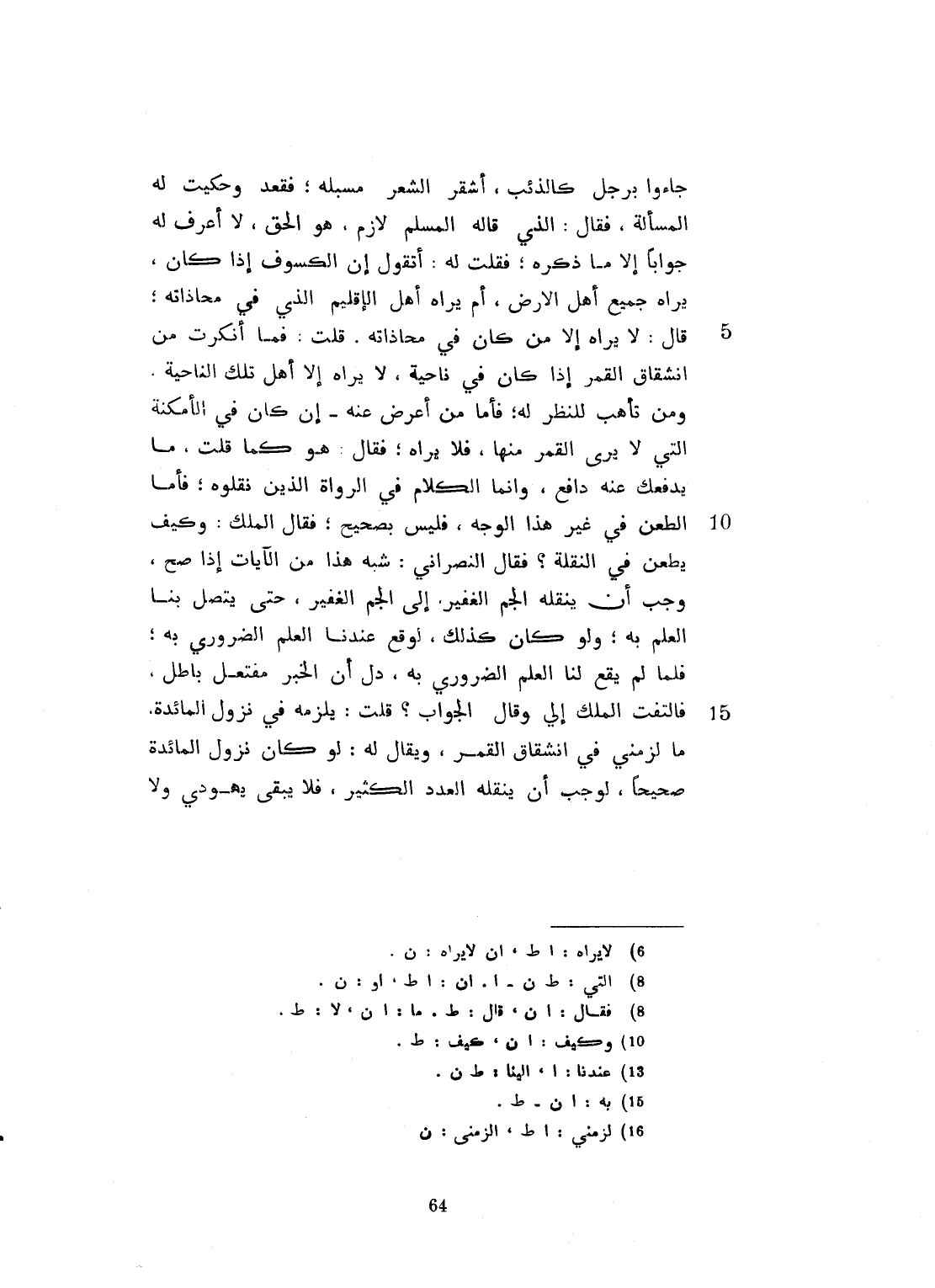 جاؤوا برجل كالذئب أشقر الشعر مسبله، فقعد، وحكيت له المسألة فقال: الذي قاله المسلم لازم، هو الحق لا أعرف له جواباً إلا ما ذكره. فقلت له: أتقول إن الكسوف إذا كان، يراه جميع أهل الأرض أم يراه أهل الإقليم الذي بمحاذاته؟ قال: لا يراه إلا من كان في محاذاته. قلت: فما أنكرت من انشقاق القمر، إذا كان في ناحية لا يراه إلا أهل تلك الناحية، ومن تأهب للنظر له؟ فأما من أعرض عنه، وكان في الأمكنة التي لا يرى القمر منها فلا يراه. فقال: هو كما قلت. ما يدفعك عنه دافع. وإنما الكلام في الرواة الذين نقلوه. وأما الطعن في غير هذا الوجه، فليس بصحيح. فقال الملك: وكيف يطعن في النقلة؟ فقال النصراني: شبه هذا من الآيات، إذا صح، وجب أن ينقله الجم الغفير، الى الجم الغفير، حتى يتصل بنا العلم الضروري به، ولو كان كذلك، لوقع إلينا العلم الضروري به. فلما لم يقع لنا العلم الضروري به، دلّ أن الخبر مفتعل باطل. فالتفت الملك إليّ وقال: الجواب. قلت: يلزمه في نزول المائدة، ما يلزمني في انشقاق القمر، ويقال له لو كان نزول المائدة صحيحاً، لوجب أن ينقله العدد الكثير، فلا يبقى يهودي ولا