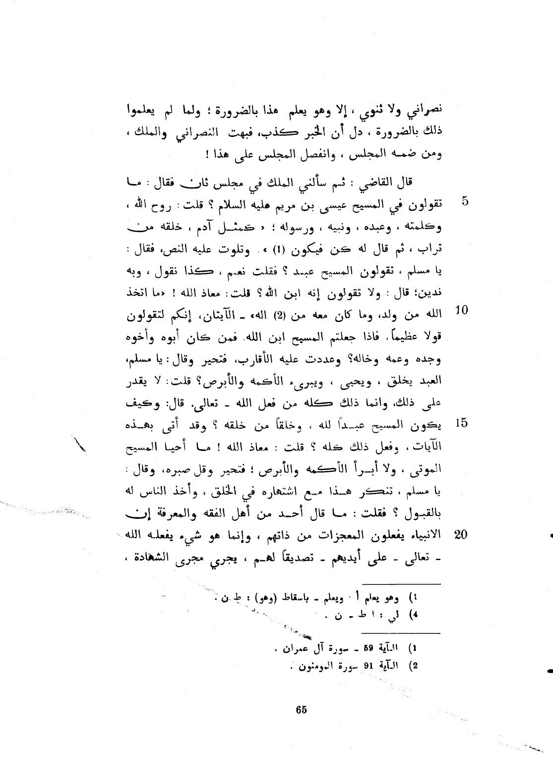 قال القاضي: ثم سألني الملك في مجلس ثانٍ، فقال: ما تقولون في المسيح عيسى بن مريم عليه السلام؟ قلت روح الله، وكلمته، وعبده، ونبيه، ورسوله. كمثل آدم خلقه من تراب، ثم قال له: كن، فيكون. وتلوت عليه النص. فقال: يا مسلم تقولون: المسيح عبد، فقلت: نعم، كذا نقول، وبه ندين. قال: ولا تقولون إنه ابن الله؟ قلت: معاذ الله، " ما اتخذ الله من ولد وما كان معه من إله " الآيتان، إنكم لتقولون قولاً عظيماً. فإذا جعلتم المسيح ابن الله، فمن أبوه وأخوه وجده وعم وخاله. وعددت عليه الأقارب، فتحيّر وقال: يا مسلم، العبد يخلق، ويحيي ويميت ويبرئ الأكمه والأبرص؟ قلت: لا يقدر العبد على ذلك وإنما ذلك كله من فعل الله عز وجلّ. قال: وكيف يكون المسيح عبداً لله وخلقاً من خلقه، وقد أتى بهذه الآيات، وفعل ذلك كله؟ قلت: معاذ الله ما أحيى المسيح الموتى ولا أبرأ الأكمه والأبرص. فتحيّر وقلّ صبره، وقال: يا مسلم، تنكر هذا مع اشتهاره في الخلق، وأخذ الناس له بالقبول؟ فقلت: ما قال أحد من أهل الفقه والمعرفة، إن الأنبياء عليهم السلام، يفعلون المعجزات من ذاتهم. وإنما هو شيء يفعله الله تعالى على أيديهم، تصديقاً لهم، يجري مجرى الشهادة.