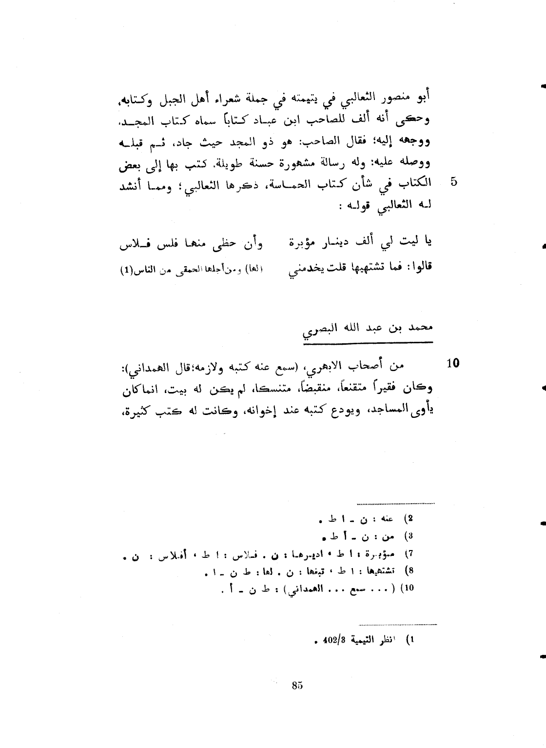 أبو منصور الثعالبي في يتيمته في جملة شعراء أهل الجبل من كتابه. وحكى عنه أنه ألّف للصاحب ابن عباد كتاباً سماه كتاب المجد ووجهه إليه. فقال الصاحب: وذو المجد حيث جاء ثم قبله ووصلَه. وله رسالة مشهورة حسنة طويلة كتب بها الى بعض الكتّاب في شأن كتاب الحماسة ذكرها الثعالبي، ومما أنشد له الثعالبي قوله: