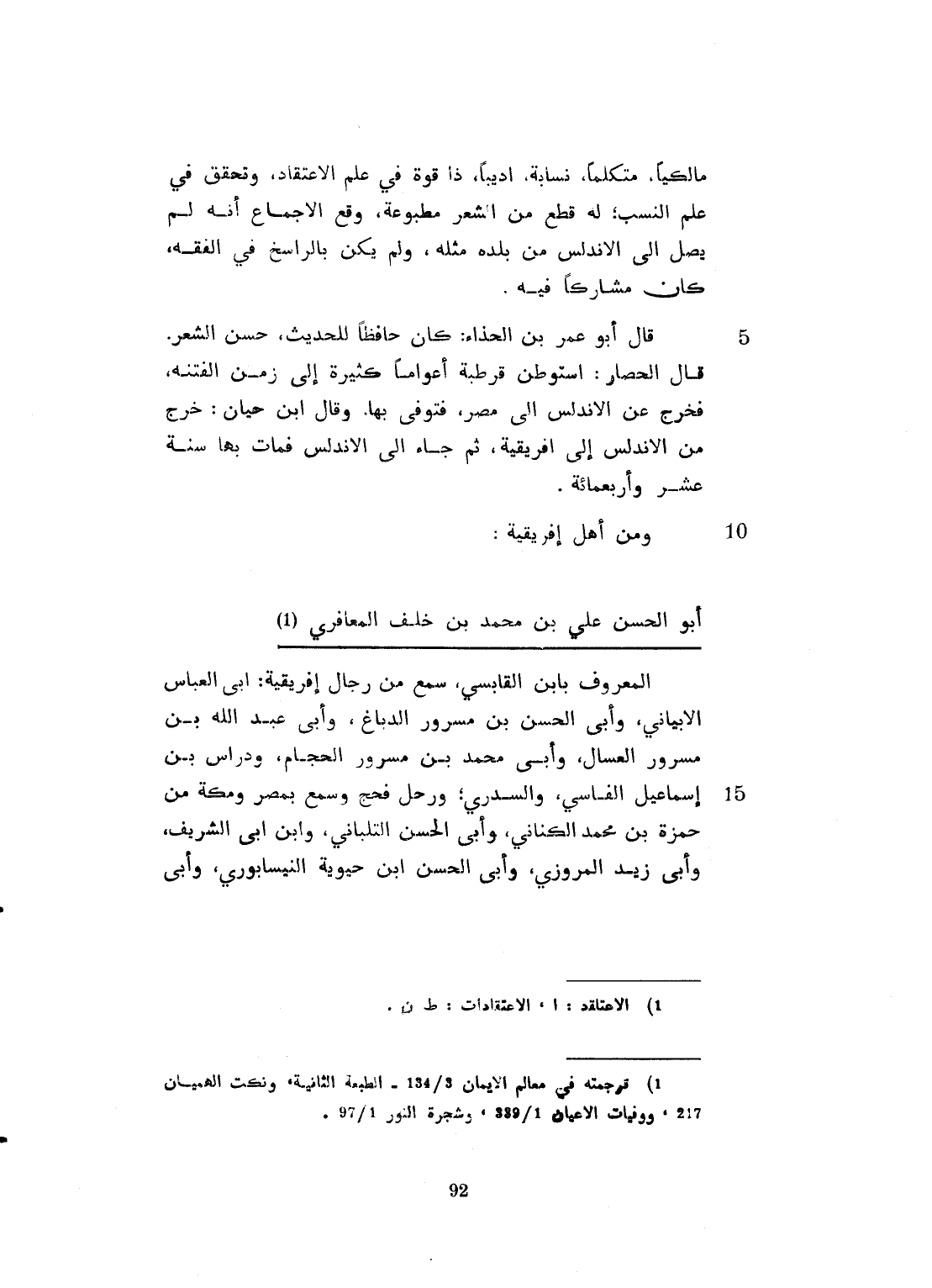 مالكياً متكلماً نسابة أدبياً، ذا قوة في علم الاعتقاد ويحقق في علم النسب. له قطع من الشعر مطبوعة. وقع الاجتماع أنه لم يصل الى الأندلس من بلده مثله. ولم يكن بالراسخ في الفقه، كان مشاوراً فيه، قال أبو عمر ابن الحذاء كان حافظاً للحديث حسن الشعر، قال الحصار: استوطن قرطبة أعواماً كثيرة الى زمن الفتنة، فخرج عن الأندلس الى مصر فتوفي بها. وقال ابن حيان: خرج من الأندلس الى إفريقية ثم جاء الى الأندلس فمات بها سنة عشرة وأربعماية.