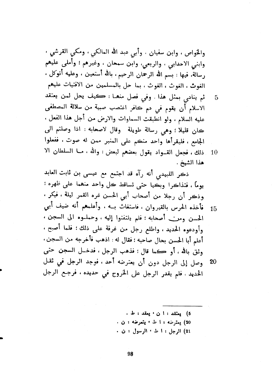 والخواص، وابن سفيان، وأبي عبد الله المالكي، ومكي الفارسي، وابن الأجدابي، والربعي، وابن سمحان، وغيرهم، وأملى عليهم رسالة فيها: بسم الله الرحمن الرحيم بالله أستعين، وعليه أتوكل. الغوث الغوث الغوث بما حلّ بالمسلمين من الافتئات عليهم، ثم ينادي بمثل. وفي فصل منها: كيف يحل لمن يعتقد الإسلام أن يقوم في دم كافر اغتصب صبية من سلالة المصطفى صلى الله عليه وسلم. لو انطبقت السماوات والأرض من أجل هذا الفعل كان قليلاً. وهي رسالة طويلة. وقال لأصحابه إذا وصلتم الى الجامع فليقرأها واحد منكم على المنبر ممن له صوت. ففعلوا ذلك فجعل القواد يقول بعضهم لبعض والله ما السلطان إلا هذا الشيخ. ذكر البيري أنه رآه قد اجتمع مع عيسى بن ثابت العابد يوماً فتذاكرا وبكيا حتى سقط كل واحد منهما على ظهره. وذكر أن رجلاً من أصحاب أبي إسحاق غره القمر ليلة فبكر فأخذه الحرس بالقيروان فاستغاث به وأعلمهم أنه ضيف أبي الحسن ومن أصحابه، فلم يلتفتوا إليه، وحملوه الى السجن وأودعوه الحديد، وأطلع رجل من غرفة على ذلك، فلما أصبح، أعلم أبا الحسن بحال صاحبه، فقال له اذهب فأخرجه من السجن، وثق بالله، أو كما قال، فذهب الرجل فدخل الى السجن حتى وصل الى الرجل دون أن يعترضه أحد، فوجد الرجل في ثقل الحديد، فلم يقدر الرجل على الخروج في حديده، فرجع الرسول