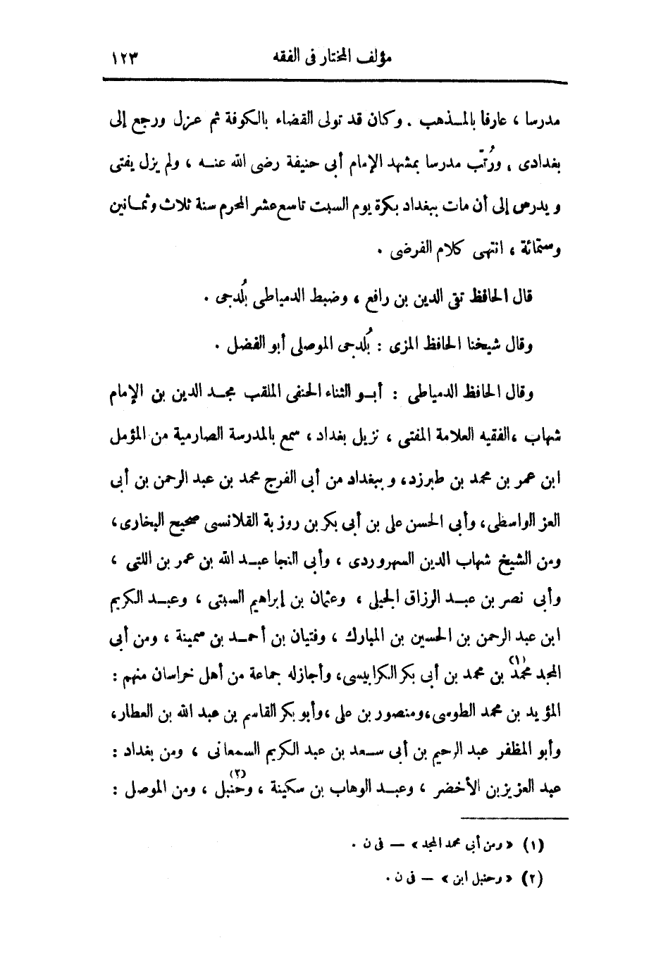 مدرساً عارفاً بالمذهب، وكان قد تولى القضاء بالكوفة ثم عزل ورجع إلى بغدادي، ورتب مدرساً بمشهد الإمام أبي حنيفة رضي الله عنه، ولم يزل يفتي ويدرس إلى أن مات ببغداد بكرة يوم السبت تاسع عشر المحرم سنة ثلاث وثمانين وستمائة، انتهى كلام الفرضي.