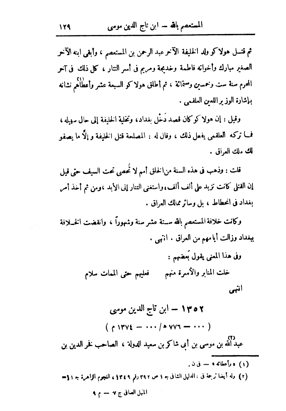 قلت: وذهب في هذه السنة من الخلق أمم لا تحصى تحت السيف حتى قيل إن القتلى كانت تزيد على ألف ألف، واستغنى التتار إلى الأبد، ومن ثم أخذ أمر بغداد في انحطاط، بل وسائر ممالك العراق.