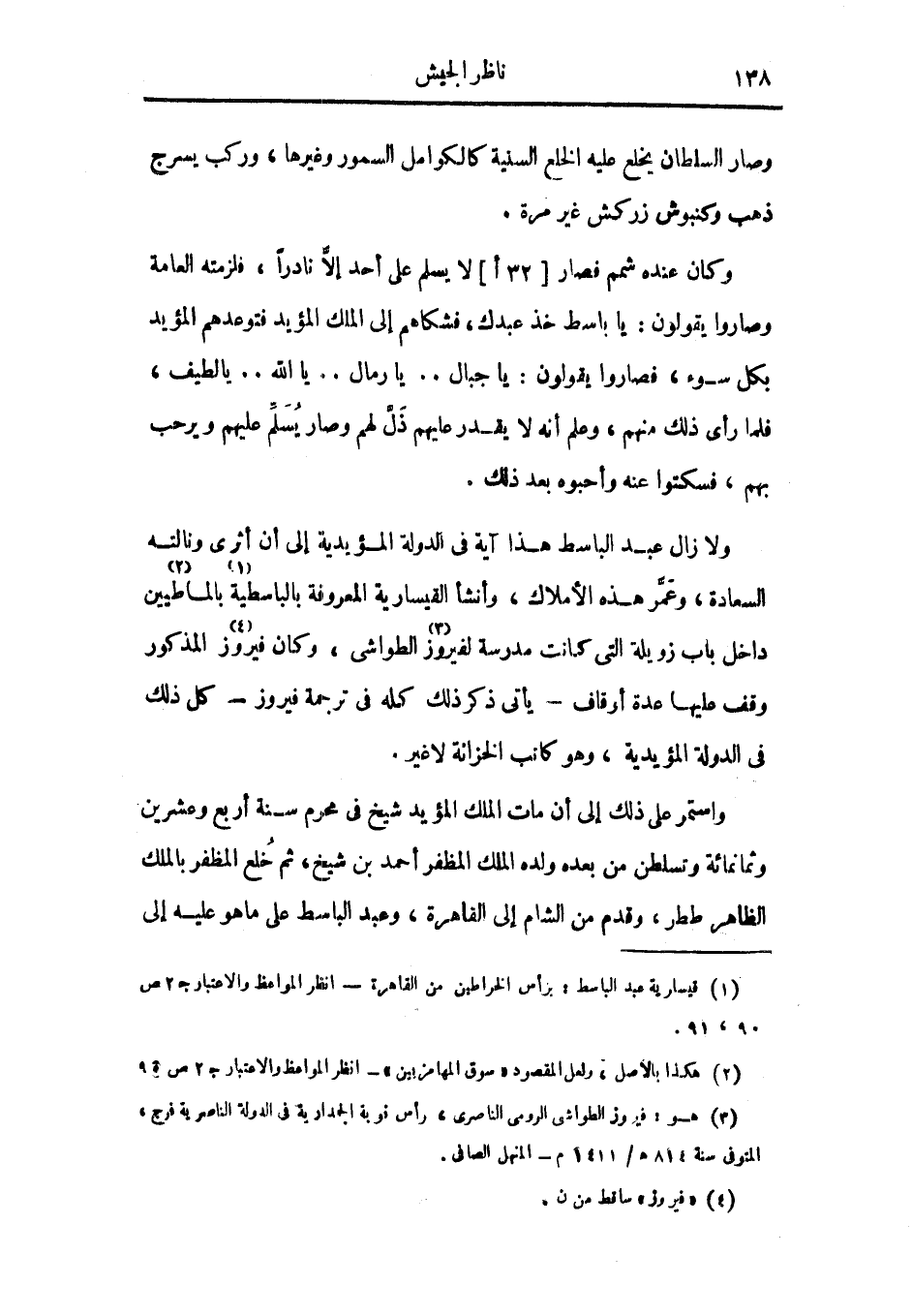 واستمر على ذلك إلى أن مات الملك المؤيد شيخ في محرم سنة أربع وعشرين وثمانمائة وتسلطن من بعده ولده الملك المظفر أحمد بن شيخ، ثم خلع المظفر بالملك الظاهر ططر، وقدم من الشام إلى القاهرة، وعبد الباسط على ما هو عليه إلى