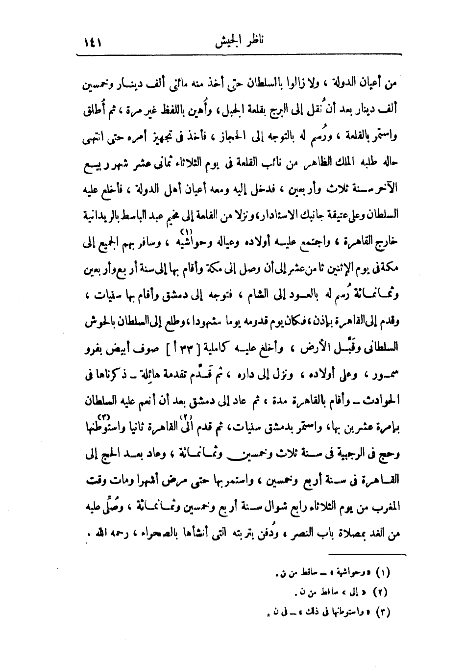 من أعيان الدولة، ولا زالوا بالسلطان حتى أخذ منه مائتي ألف دينار وخمسين ألف دينار بعد أن نقل إلى البرج بقلعة الجبل، وأهين باللفظ غير مرة، ثم أطلق واستمر بالقلعة، ورسم له بالتوجه إلى الحجاز، فأخذ في تجهيز أمره حتى انتهى حاله طلبه الملك الظاهر من نائب القلعة في يوم الثلاثاء ثماني عشر شهر ربيع الآخر سنة ثلاث وأربعين، فدخل إله ومعه أعيان أهل الدولة، فأخلع عليه السلطان وعلى عتيقة جانبك الإستادار، ونزلا من القلعة إلى مخيم عبد الباسط بالريدانية خارج القاهرة، واجتمع عليه أولاده وعياله وحواشيه، وسافر بهم الجميع إلى مكة في يوم الاثنين ثامن عشر إلى أن وصل إلى مكة وأقام بها إلى سنة أربع وأربعين وثمانمائة رسم له بالعود إلى الشام، فتوجه إلى دمشق وأقام بها سنيات، وقدم إلى القاهرة بإذن، فكان يوم قدومه يوماً مشهوداً، وطلع إلى السلطان بالحوش السلطاني وقبل الأرض، وأخلع عليه كاملية صوف أبيض بفرو سمور، وعلى أولاده، ونزل إلىداره، ثم قدم تقدمة هائلة - ذكرناها في الحوادث - وأقام بالقاهرة مدة، ثم عاد إلى دمشق بعد أن أنعم عليه السلطان بإمرة عشرين بها، واستمر بدمشق سنيات، ثم قدم إلى القاهرة ثانياً واستوطنها وحج في الرجبية في سنة ثلاث وخمسين وثمانمائة، وعاد بعد الحج إلى القاهرة في سنة أربع وخمسين، واستمر بها حتى مرض أشهراً ومات وقت المغرب من يوم الثلاثاء رابع شوال سنة أربع وخمسين وثمانمائة، وصلى عليه من الغد بمصلاة باب النصر، ودفن بتربته التي أنشأها بالصحراء، رحمه الله.
