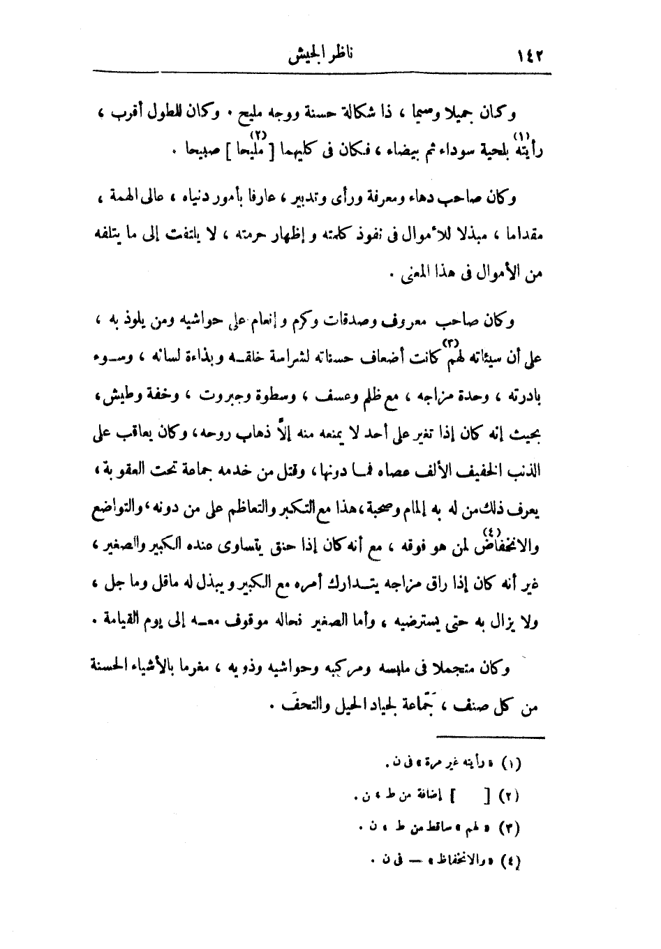 وكان صاحب معروف وصدقات وكرم وإنعام على حواشيه ومن يلوذ به، على أن سيئاته لهم كانت أضعاف حسناته لشراسة خلقه وبذاءة لسانه، وسوء بادرته، وحدة مزاجه، مع ظلم وعسف، وسطوة وجبروت، وخفة وطيش، بحيث إنه كان إذا تغير على أحد لا يمنعه منه إلا ذهاب روحه، وكان يعاقب على الذئب الخفيف الألف عصاه فما دونها، وقتل من خدمه جماعة تحت العقوبة، يعرف ذلك من له به إلمام وصحبة، هذا مع التكبر والتعاظم على من دونه، والتواضع والانخفاض لمن هو فوقه، مع أنه كان إذا حنق يتساوى عنده الكبير والصغير، غير أنه كان إذا راق مزاجه يتدارك أمره مع الكبير ويبذل له ما قل وما جل، ولا يزال به حتى يسترضيه، وأما الصغير فحاله موقوف معه إلى يوم القيامة.