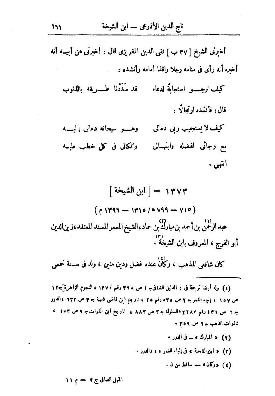 أخبرني الشيخ تقي الدين المقريزي قال: أخبرني عن أبيه أنه أخبره أنه رأى في منامه رجلاً واقفاً أمامه وأنشده: