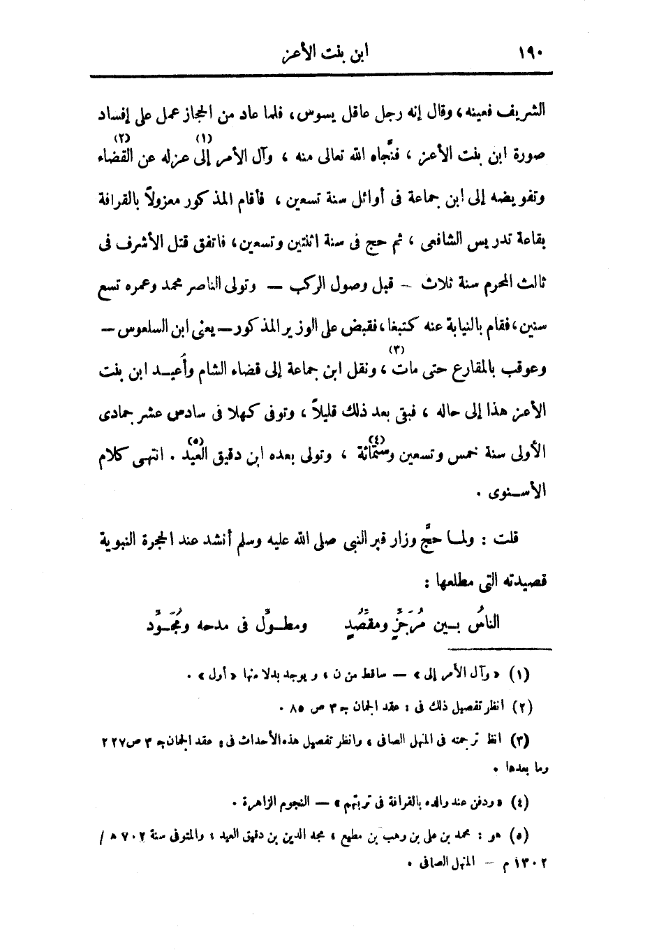 الشريف فعينه، وقال أنه رجل عاقل يسوس، فلما عاد من الحجاز عمل على إفساد صورة ابن بنت الأعز، فنجاه الله تعالى منه، وآل الأمر إلى عزله عن القضاء وتفويضه إلى ابن جماعة في أوائل سنة تسعين، فأقام المذكور معزولاً بالقرافة بقاعة تدريس الشافعي، ثم حج في سنة اثنتين وتسعين، فاتفق قتل الأشرف في ثالث المحرم سنة ثلاث - قبل وصول الركب - وتولى الناصر محمد وعمره تسع سنين، فقام بالنيابة عنه كتبغا، فقبض على الوزير المذكور - يعني ابن السلعوس - وعوقب بالمقارع حتى مات، ونقل ابن جماعة إلى قضاء الشام وأعيد ابن بنت الأعز هذا إلى حاله، فبقي بعد ذلك قليلاً، وتوفي كهلاً في سادس عشر جمادى الأولى سنة خمس وتسعين وستمائة، وتولى بعده ابن دقيق العيد. انتهى كلام الأسنوي.