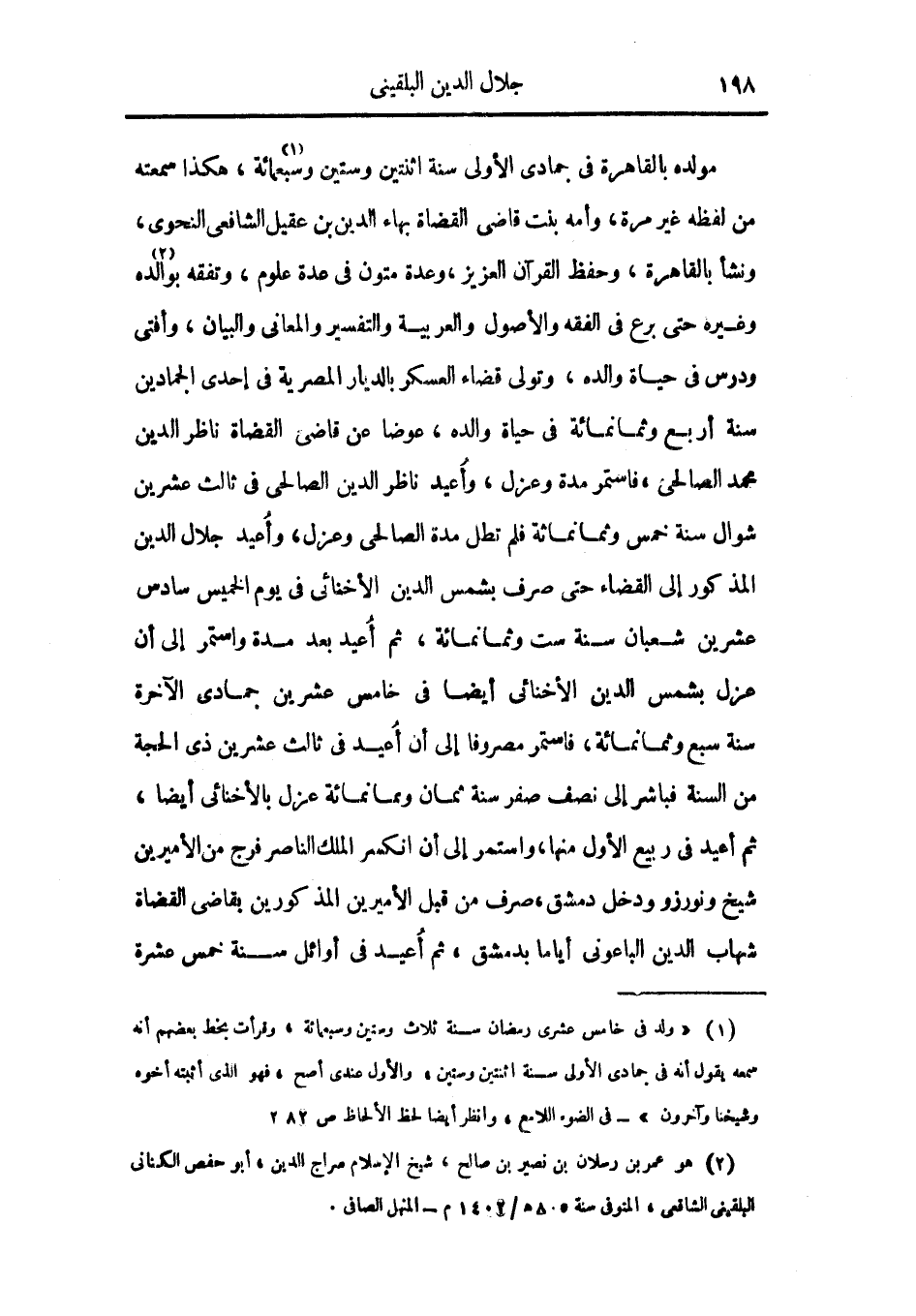 مولده بالقاهرة في جمادى الأولى سنة اثنتين وستين وسبعمائة، هكذا سمعته من لفظه غير مرة، ومه بنت قاضي القضاة بهاء الدين بن عقيل الشافعي النحوي، ونشأ بالقاهرة، وحفظ القرآن العزيز، وعدة متون في عدة علوم، وتفقه بوالده وغيره حتى برع في الفقه والأصول والعربية والتفسير والمعاني والبيان، وأفتى ودرس في حياة والده، وتولى قضاء العسكر بالديار المصرية في إحدى الجمادين سنة أربع وثمانمائة في حياة والده، عوضاً عن قاضي القضاة ناظر الدين محمد الصالحي، فاستمر مدة وعزل، وأعيد ناظر الدين الصالحي في ثالث عشرين شوال سنة خمس وثمانمائة فلم تطل مدة الصالحي وعزل، وأعيد جلال الدين المذكور إلى القضاء حتى صرف بشمس الدين الأخنائي في يوم الخميس سادس عشرين شعبان سنة ست وثمانمائة، ثم أعيد بعد مدة واستمر إلى أن عزل بشمس الدين الأخنائي أيضاً في خامس عشرين جمادى الآخرة سنة سبع وثمانمائة، فاستمر مصروفاً إلى أن أعيد في ثالث عشرين ذي الحجة من السنة فباشر إلى نصف صفر سنة ثمان وثمانمائة عزل بالأخنائي أيضاً، ثم أعيد في ربيع الأول منها، واستمر إلى أن انكسر الملك الناصر فرج من الأمير بن شيخ ونورزو ودخل دمشق، صرف من قبل الأميرين المذكورين بقاضي القضاة شهاب الدين الباعوني أياماً بدمشق، ثم أعيد في أوائل سنة خمس عشرة