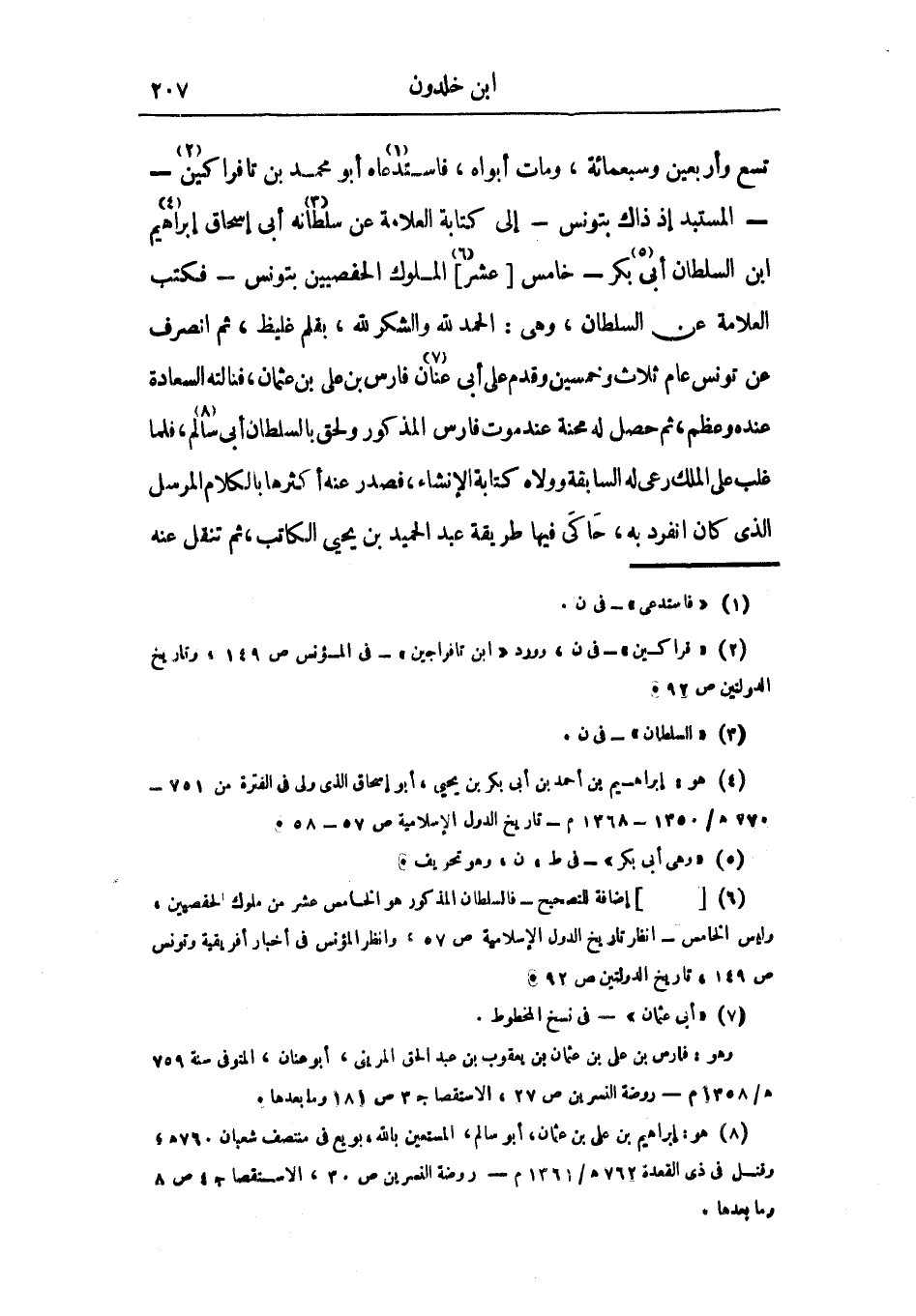 تسع وأربعين وسبعمائة، ومات بواه، فاستدعاه أبو محمد بن تافراكين - المستبد إذ ذاك بتونس - إلى كتابة العلامة عن سلطانه أبي إسحاق إبراهيم ابن السلطان أبي بكر خامس عشر الملوك الحفصيين بتونس، فكتب العلامة عن السلطان، وهي: الحمد لله والشكر لله، بقلم غليظ، ثم انصرف عن تونس عام ثلاث وخمسين وقدم على أبي عنان فارس بن علي بن عثمان، فنالته السعادة عنده وعظم، ثم حصل له محنة عند موت فارس المذكور ولحق بالسلطان أبي سالم، فلما غلب على الملك رعى له السابقة وولاه كتابة الإنشاء، فصدر عنه أكثرها بالكلام المرسل الذي كان انفرد به، حاكى فيها طريقة عبد الحميد بن يحيى الكاتب، ثم تنقل عنه