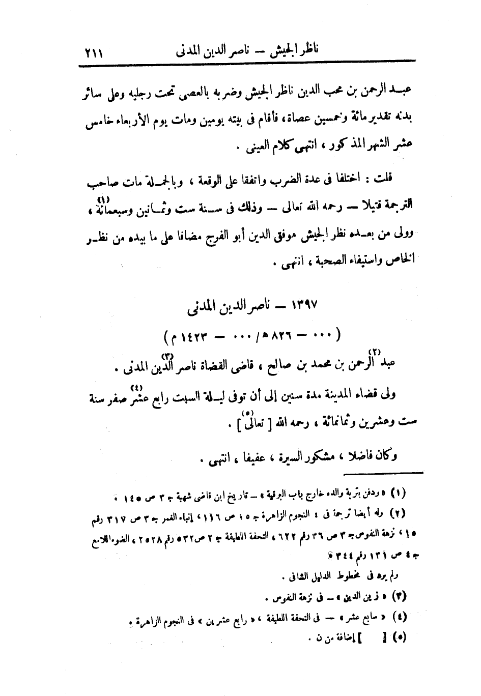 عبد الرحمن بن محب الدين ناظر الجيش وضربه بالعصي تحت رجليه وعلى سائر بدنه تقدير مائة وخمسين عصاة، فأقام في بيته يومين ومات يوم الأربعاء خامس عشر الشهر المذكور، انتهى كلام العيني.