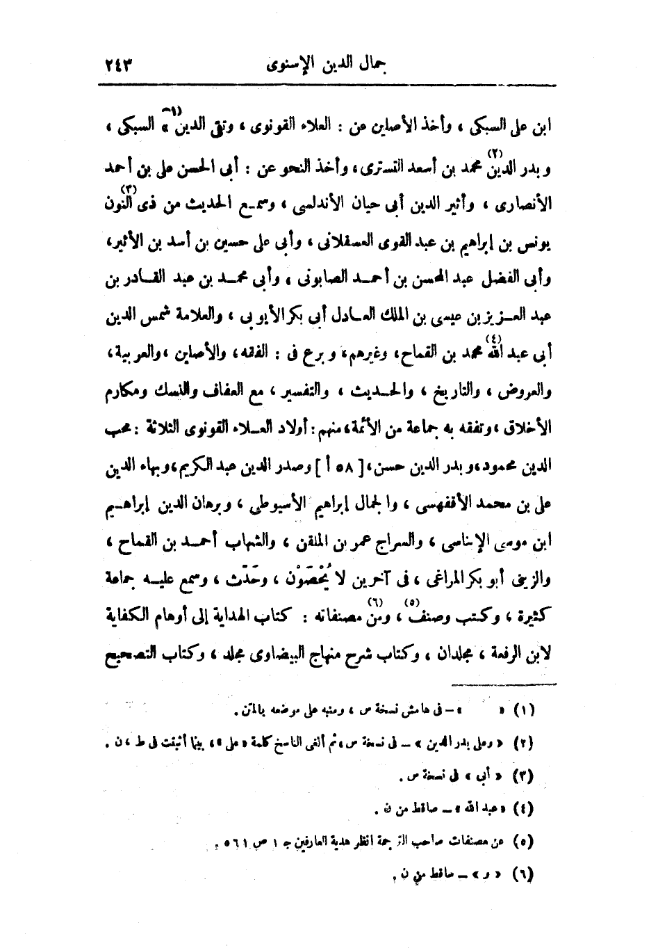 ابن علي السبكي، وأخذ الأصلين من العلاء القونوي، وتقي الدين السبكي، وبدر الدين محمد بن أعد التستري، وأخذ النحو عن: أبي الحسن علي بن أحمد الأنصاري، وأثير الدين أبي حيان الأندلسي، وسمع الحديث من ذي النون يونس بن إبراهيم بن عبد القوي العسقلاني، وأبي علي حسين بن أسد بن الأثير، وأبي الفضل عبد المحسن بن أحمد الصابوني، وأبي محمد بن عبد القادر بن عبد العزيز بن عيسى بن الملك العادل أبي بكر الأيوبي، والعلامة شمس الدين أبي عبد الله محمد بن القماح، وغيرهم، وبرع في الفقه، والأصلين، والعربية، والعروض، والتاريخ، والحديث، والتفسير، مع العفاف والنسك ومكارم الأخلاق، وتفقه به جماعة الأئمة، منهم: أولاد العلاء القونوي الثلاثة: محب الدين محمود وبدر الدين حسن، وصدر الدين عبد الكريم، وبهاء الدين علي بن محمد الأقفهسي، والجمال إبراهيم الأسيوطي، وبرهان الدين إبراهيم ابن موسى الإبناسي، والسراج عمر بن الملقن، والشهاب أحمد بن القماح، والزيني أبو بكر المراغي، في آخرين لا يحصون، وحدث، وسمع عليه جماعة كثيرة، وكتب وصنف، ومن مصنافته: كتاب الهداية إلى أوهام الكفاية لابن الرفعة، مجلدان، وكتاب شرح منهاج البيضاوي مجلد، وكتاب التصحيح