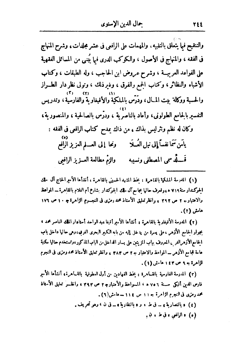 والتنقيح فيما يتعلق بالتنبيه، والمهمات على الرافعي في شعر مجلدات، وشرح المنهاج في الفقه، والمنهاج في الأصول، والكوكب الدري فيما يبنى من المسائل الفقهية على القواعد العربية، وشرح عروض ابن الحاجب، وله الطبقات، وكتاب الأشباه والنظائر، وكتاب الجمع والفرق، وغير ذلك، وتولى نظر دار الطراز والحسبة ووكالة بيت المال، ودرس بالملكية والاقبغاوية والفارسية، وتدريس التفسير بالجامع الطولوني، وأعاد بالناصرية، ودرس بالصالحية، والمنصورية، وكن له نظم ونثر ليس بذاك، من ذاك يمدح كتاب الرافعي في الفقه: