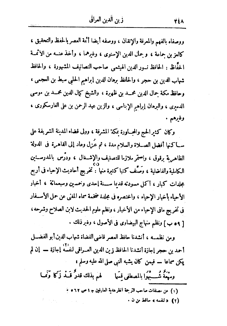ومن نظمه، أنشدنا حافظ العصر قاضي القضاة شهاب الدين أبو الفضل أحمد بن حجر إجازة أنشدنا الحافظ زين الدين العراقي لنفسه إجازة - إن لم يكن سماعاً - فيمن كان يشبه النبي صلى الله عليه وسلم: