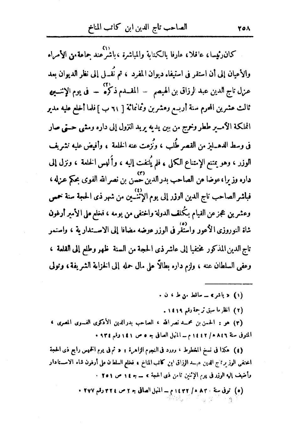 كان رئيساً، عاقلاً، عارفاً بالكتابة والمباشرة، باشر عند جماعة من الأمراء والأعيان إلى أن استقر في استيفاء ديوان المفرد، ثم نقل إلى نظر الديوان بعد عزل تاج الدين عبد الرزاق بن الهيصم - المقدم ذكره - في يوم الاثنين ثالث عشرين محرم سنة أربع وعشرين وثمانمائة فلما أخلع عليه مدير المملكة الأمير ططر وخرج من بين يديه يريد النزول إلى داره ومشى حتى صار في وسط الدهليز من القصر طلب، ونزعت عنه الخلعة، وأفيض عليه تشريف الوزر، وهو يمتنع الامتناع الكلي، فلم يلتفت إليه، وألبس الخلعة ونزل إلى داره وزيراً، عوضاً عن الصاحب بدر الدين حسن بن نصر الله الفوي بحكم عزله، فباشر الصاحب تاج الدين الوزر إلى يوم الاثنين من شهر ذي الحجة سنة خمس وعشرين عجز عن القيام بكلف الدولة واختفى من يومه، فخلع على الأمير أرغون شاة النوروزي الأعور واستقر في الوزر عوضه مضافاً إلى الإستدارية، واستمر تاج الدين المذكور مختفياً إلى عاشر ذي الحجة من السنة ظهر وطلع إلى القلعة، وعفى السلطان عنه، ولزم داره بطالاً على مال حمله إلى الخزانة الشريفة، وتولى