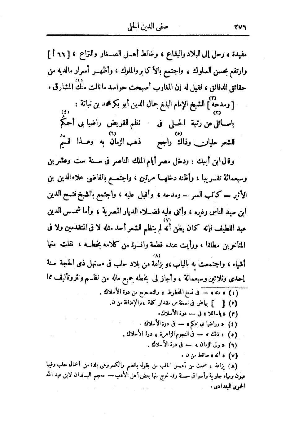 وقال ابن أيبك: ودخل مصر أيام الملك الناصر في سنة ست وعشرين وسبعمائة تقريباً، وأظنه دخلها مرتين، واجتمع بالقاضي علاء الدين بن الأثير كاتب السر ومدحه، وأقبل عليه، واجتمع بالشيخ فتح الدين ابن سيد الناس وغيره، وأثنى عليه فضلاء الديار المصرية، وأما شمس الدين عبد اللطيف فإنه كان يظن أنه لم ينظم الشعر أحد مثله لا في المتقدمين ولا في المتأخرين مطلقاً، ورأيت عنده قطعة وافرة من كلامه بخطه، نقلت منها أشياء، واجتمعت به بالباب، وبزاعة من بلاد حلب في مستهل ذي الحدة سنة إحدى وثلاثين وسبعمائة، وأجاز لي بخطه جميع ماله من نظم ونثر وتأليف مما
