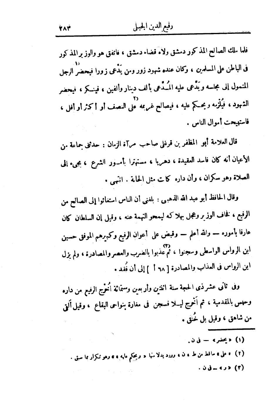 فلما ملك الصالح المذكور دمشق ولاء قضاء دمشق، فاتفق هو والوزير المذكور في الباطن على المسلمين، وكان عنده شهود زور ومن يدعى زوراً فيحضر الرجل المتمول إلى مجلسه ويدعي عليه المدعي بألف دينار وألفين، فينكر، فيحضر الشهود، فيلزمه ويحكم عليه، فيصالح غريمه على النصف أو أكثر أو أقل، فاستبيحت أموال الناس.