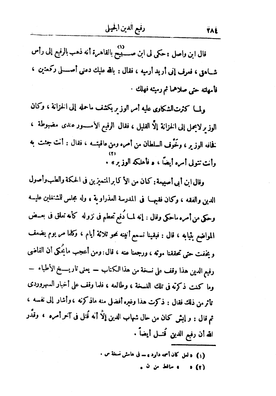قال ابن واصل: حكى لي ابن صبيح بالقاهرة أنه ذهب بالرفيع إلى رأس شاهق، فعرف إني أريد أرميه، فقال: بالله عليك عني أصلي ركعتين، فأمهلته حتى صلاهما ثم رميته فهلك.