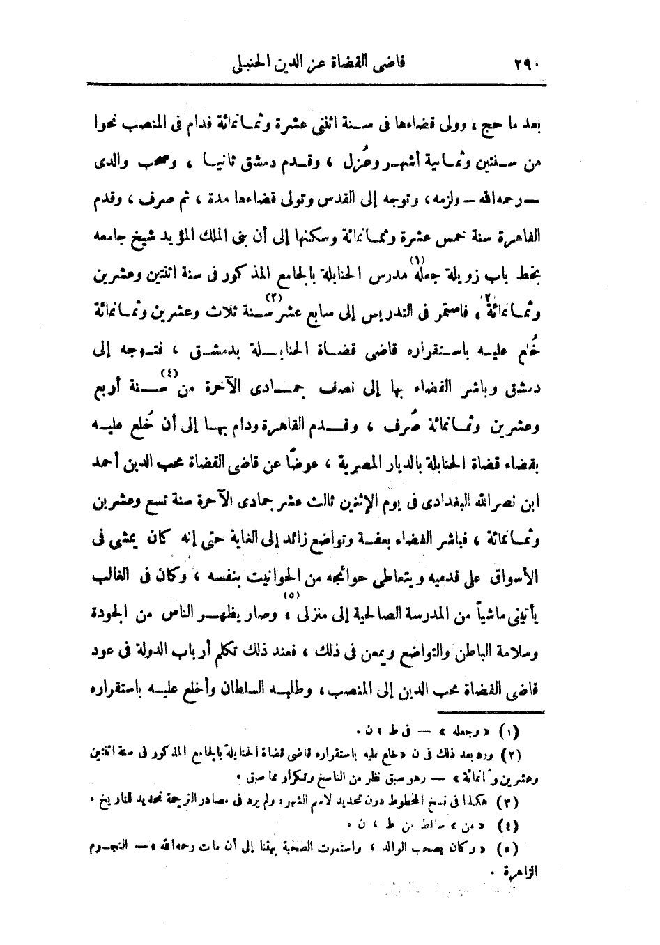 بعد ما حج، وولي قضاءها في سنة اثنتي عشرة وثمانمائة فدام في المنصب نحواً من سنتين وثمانية أشهر وعزل، وقدم دمشق ثانياً، وصحب والدي رحمه الله ولزمه، وتوجه إلى القدس وتولى قضاءها مدة، ثم صرف، وقدم القاهرة سنة خمس عشرة وثمانمائة وسكنها إلى أن بنى الملك المؤيد شيخ جامعه بخط باب زويلة جعله مدرس الحنابلة بالجامع المذكور في سنة اثنتين وعشرين وثمانمائة، فاستمر في التدريس إلى سابع عشر سنة ثلاث وعشرين وثمانمائة خلع عليه باستقراره قاضي القضاة الحنابلة بدمشق، فتوجه إلى دمشق وباشر القضاء بها إلى نصف جمادى الآخرة من سنة أربع وعشرين وثمانمائة صرف، وقدم القاهرة ودام بها إلى أن خلع عليه بقضاء قضاة الحنابلة بالديار المصرية، عوضاً عن قاضي القضاة محب الدين أحمد ابن نصر الله البغدادي في يوم الاثنين ثالث عشر جمادى الآخرة سنة تسع وعشرين وثمانمائة، فباشر القضاء بعفة وتواضع زائد إلى الغاية حتى إنه كان يمشي في الأسواق على قدميه ويتعاطى حوائجه من الحوانيت بنفسه، وكان في الغلاب يأتيني ماشياً من المدرسة الصالحية إلى منزلي، وصار يظهر الناس من الجودة وسلامة الباطن والتواضع ويمعن في ذلك، فعند ذلك تكلم أرباب الدولة في عود قاضي القضاة محب الدين إلى المنصب، وطلبه السلطان وأخلع عليه باستقراره
