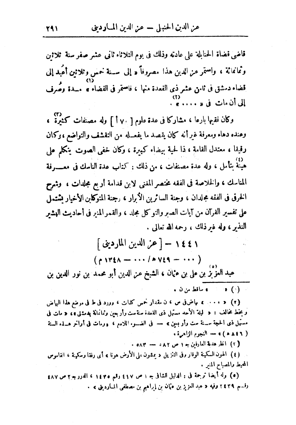 قاضي القضاة الحنابلة على عادته وذلك في يوم الثلاثاء ثاني عشر صفر سنة ثلاثين وثمانمائة، واستمر عز الدين هذا مصروفاً إلى سنة خمس وثلاثين أعيد إلى قضاء دمشق في ثامن عشر ذي القعدة منها، فاستمر في القضاء مدة وصرف إلى أن مات في ...