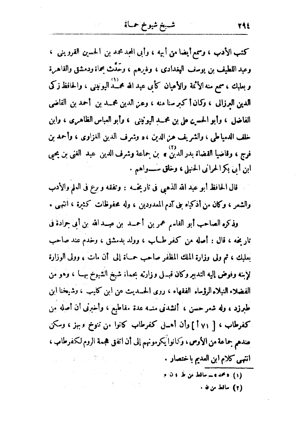 وذكره الصاحب أبو القاسم عمر بن أحمد بن عبد الله بن أبي جرادة في تاريخه، قال: أصله من كفر طاب، وولد بدمشق، وخدم عند صاحب بعلبك، ثم ولي وزارة الملك المظفر صاحب حماة إلى أن مات، وولي الوزارة لابنه وفوض إليه التدبير وكان قبل وزارته بحماة شيخ الشيوخ بها، وهو من الفضلاء النبلاء الرؤساء الفقهاء، روى الحديث عن ابن كليب، وشيخنا ابن طبرزد، وله شعر حسن، أنشدني منه عدة مقاطيع، وأخبرني أن أصله من كفر طاب، وأن أهل كفر طاب كانوا من تنوخ وبهز، وسكن عندهم جماعة من الأوس، وكانوا يكرمونهم إلى أن اتفق هجمة الروم لكفر طاب، انتهى كلام ابن العديم باختصار.