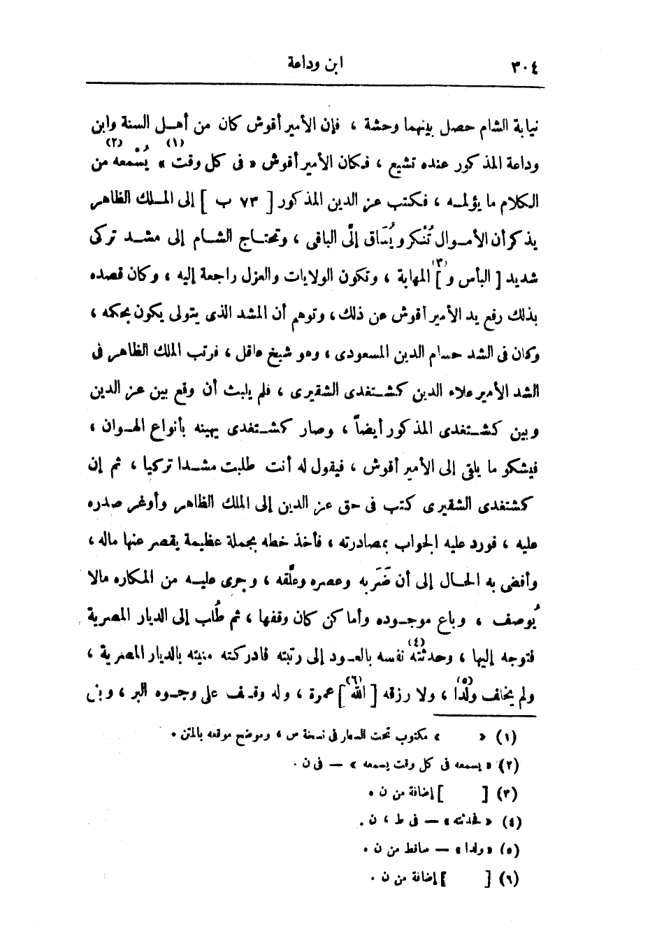 نيابة الشام حصل بينهما وحشة، فإن الأمير أقوش كان من أهل السنة وابن وداعة المذكور عنده تشيع، فكان الأمير أقوش في كل وقت يسمعه من الكلام ما يؤلمه، فكتب عز الدين المذكور إلى الملك الظاهر يذكر أن الأموال تنكر ويساق إلى الباقي، وتحتاج الشام إلى مشد تركي شديد البأس والمهابة، وتكون الولايات والعزل راجعة إليه، وكان قصده بذلك رفع يد الأمير أقوش عن ذلك، وتوهم أن المشد الذي يتولى يكون بحكمه، وكان في الشد حسام الدين المسعودي، وهو شيخ عاقل، فرتب الملك الظاهر في الشد الأمير علاء الدين كشتغدي الشقيري، فلم يلبث أن وقع بين عز الدين وبين كشتغدي المذكور أيضاً وصار كشتغدي يهينه بأنواع الهوان، فيشكو ما يلقي إلى الأمير أقوش، فيقول له أنت طلبت مشداً تركياً، ثم إن كشتغدي الشقيري كتب في حق عز الدين إلى الملك الظاهر وأوغر صدره عليه، فورد عليه الجواب بمصادرته، فأخذ خطه بجملة عظيمة يقصر عنها ماله، وأفض به الحال إلى أن ضربه وعصره وعلقه، وجرى عليه من المكاره مالاً يوصف وباع موجوده وأماكن كان وقفها، ثم طلب إلى الديار المصرية فتوجه إليها، وحدثته نفسه بالعود إلى رتبته فأدركته منيته بالديار المصرية، ولم يخلف ولداً، ولا رزقه الله عمرة، وله وقف على وجوه البر، وبنى
