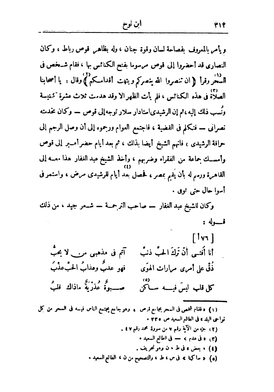 ويأمر بالمعروف بفصاحة لسان وقوة جنان، وله بظاهر قوص ربط، وكان النصارى قد أحضروا إلى قوص مرسوماً بفتح الكنائس بها، فقام شخص في السحر وقرأ " إن تنصروا الله ينصركم ويثبت أقدامكم " وقال: يا أصحابنا الصلاة في هذه الكنائس، فلم يأت الظهر إلى وقد هدمت ثلاث عشرة كنيسة ونسب ذلك إليه، ثم إن الرشيدي إستادار سلار توجه إلى قوص - وكان بخدمته نصراني - فتكلم في القضية، فاجتمع العوام ورجموه إلى أن وصل الرجم إلى حرافة الرشيدي، فاتهم الشيخ أيضاً بذلك، ثم بعد أيام حضر أمير إلى قوص وأمسك جماعة من الفقراء وضربهم، وأخذ الشيخ عبد الغفار هذا معه إلى القاهرة ورسم له بأن يقيم بمصر، فحصل بعد أيام للرشيدي مرض، واستمر في أسوأ حال حتى توفي.