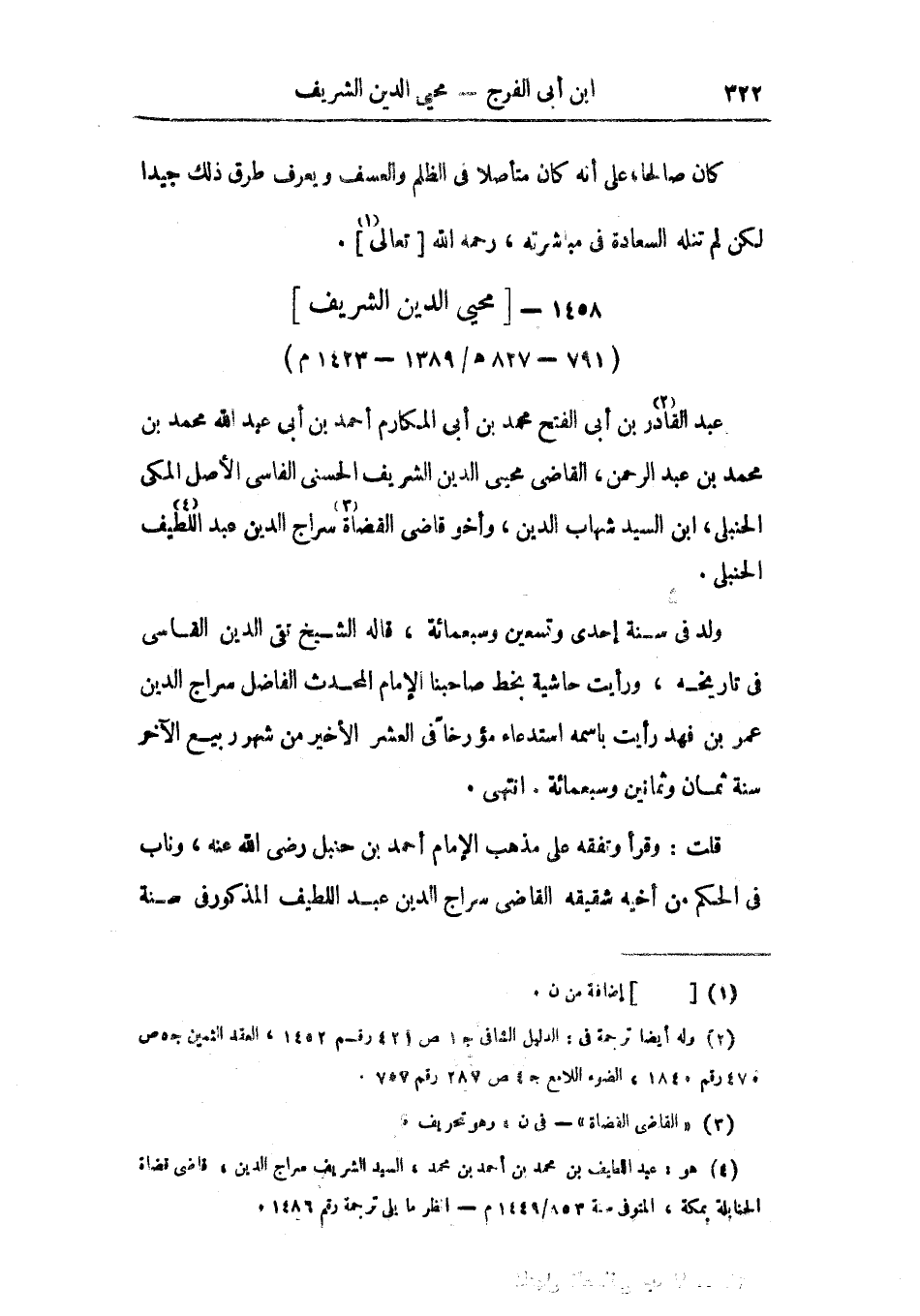 قلت: وقرا وتفقه على مذهب الإمام أحمد بن حنبل رضي الله عنه، وناب في الحكم من أخيه شقيقه القاضي سراج الدين عبد اللطيف المذكور في سنة