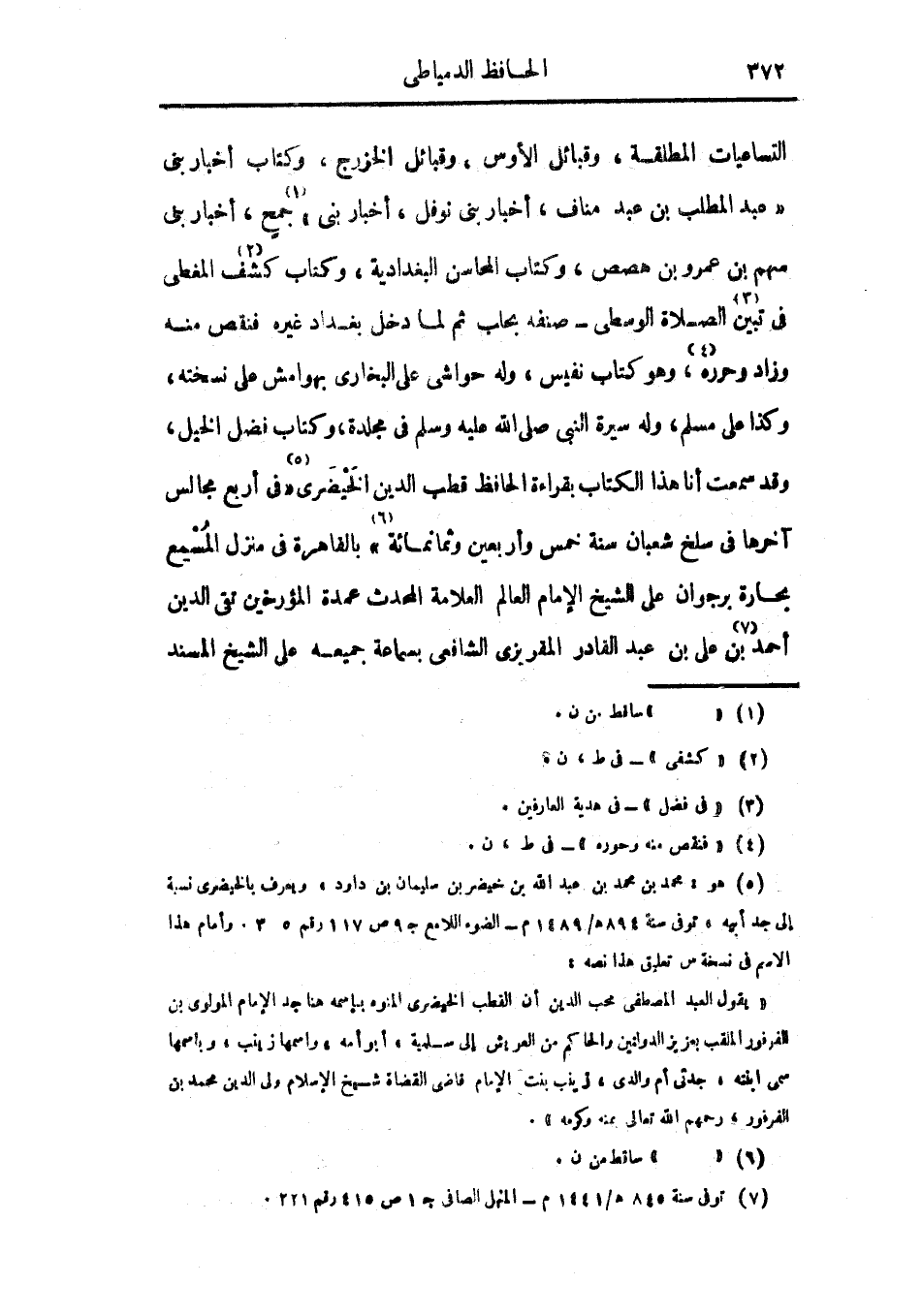 التساعيات المطلقة، وقبائل الأوس، وقبائل الخزرج، وكتاب أخبار بني عبد المطلب بن عبد مناف، أخبار بني نوفل، أخبار بني جمح، أخبار بني سهم بن عمرو بن هصص، وكتاب المحاسن البغدادية، وكتاب كشف المغطى في تبين الصلاة الوسطى صنفه بحلب ثم لما دخل بغداد غيره فنقص منه وزاد وحرره، وهو كتاب نفيس، وله حواشي على البخاري بهوامش على نسخته، وكذا على مسلم، وله سيرة النبي صلى الله عليه وسلم في مجلدة، وكتاب فضل الخيل، وقد سمعت أنا هذا الكتاب بقراءة الحافظ قطب الدين الخيضري في أربع مجالس آخرها في سلخ شعبان سنة خمس وأربعين وثمانمائة بالقاهرة في منزل المسمع بحارة برجوان على الشيخ الإمام العلامة المحدث عمدة المؤرخين تقي الدين أحمد بن علي بن عبد القادر المقريزي الشافعي بسماعة جميعه على الشيخ المسند
