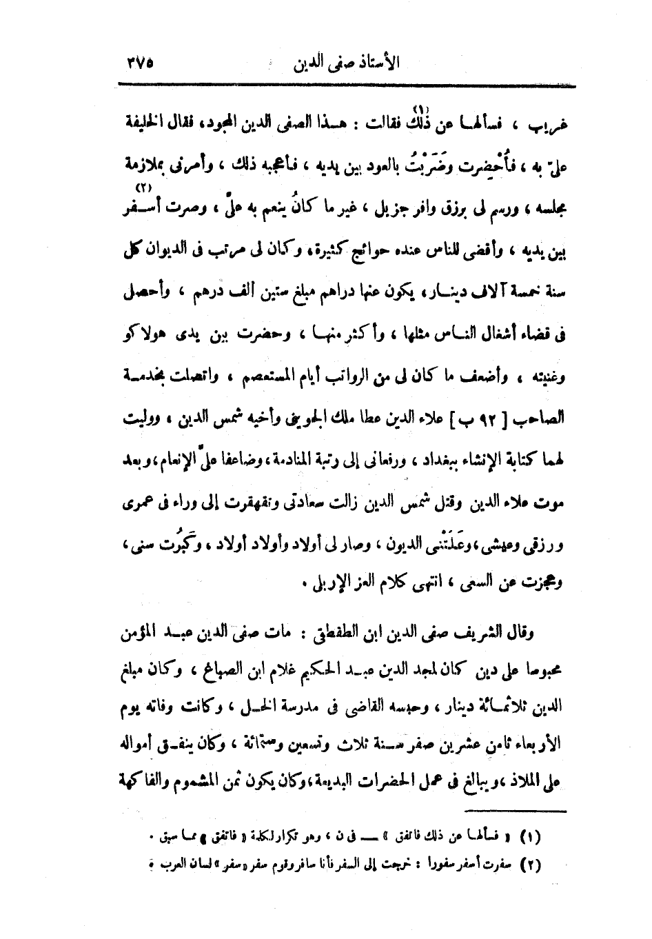 غريب، فسألها عن ذلك فقالت: هذا الصفي الدين المجود، فقال الخليفة علي به، فأحضرت وضربت بالعود بين يديهن فأعجبه ذلك، وأمرني بملازمة مجلسه، ورسم لي برزق وافر جزيل، غير ما كان ينعم به علي، وصرت أسفر بين يديه، وأقضي للناس عنده حوائج كثيرة، وكان لي مرتب في الديوان كل سنة خمسة آلاف دينار، يكون عنها دراهم مبلغ ستين ألف درهم، وأحصل في قضاء أشغال الناس مثلها، وأكثر منها، وحضرت بين يدي هولاكو وغنيته، وأضعف ما كان لي من الرواتب أيام المستعصم، واتصلت بخدمة الصاحب علاء الدين عطا ملك الجويني وأخيه شمس الدين، ووليت لهما كتابة الإنشاء ببغداد، ورفعاني إلى رتبة المنادمة، وضاعفا علي الإنعام، وبعد موت علاء الدين وقتل شمس الدين زالت سعادتي وتقهقرت إلى وراء في عمري ورزقي وعيشي، وعلتني الديون، وصار لي أولاد وأولاد أولاد، وكبرت سني، وعجزت عن السعي، انتهى كلام العز الإربلي.