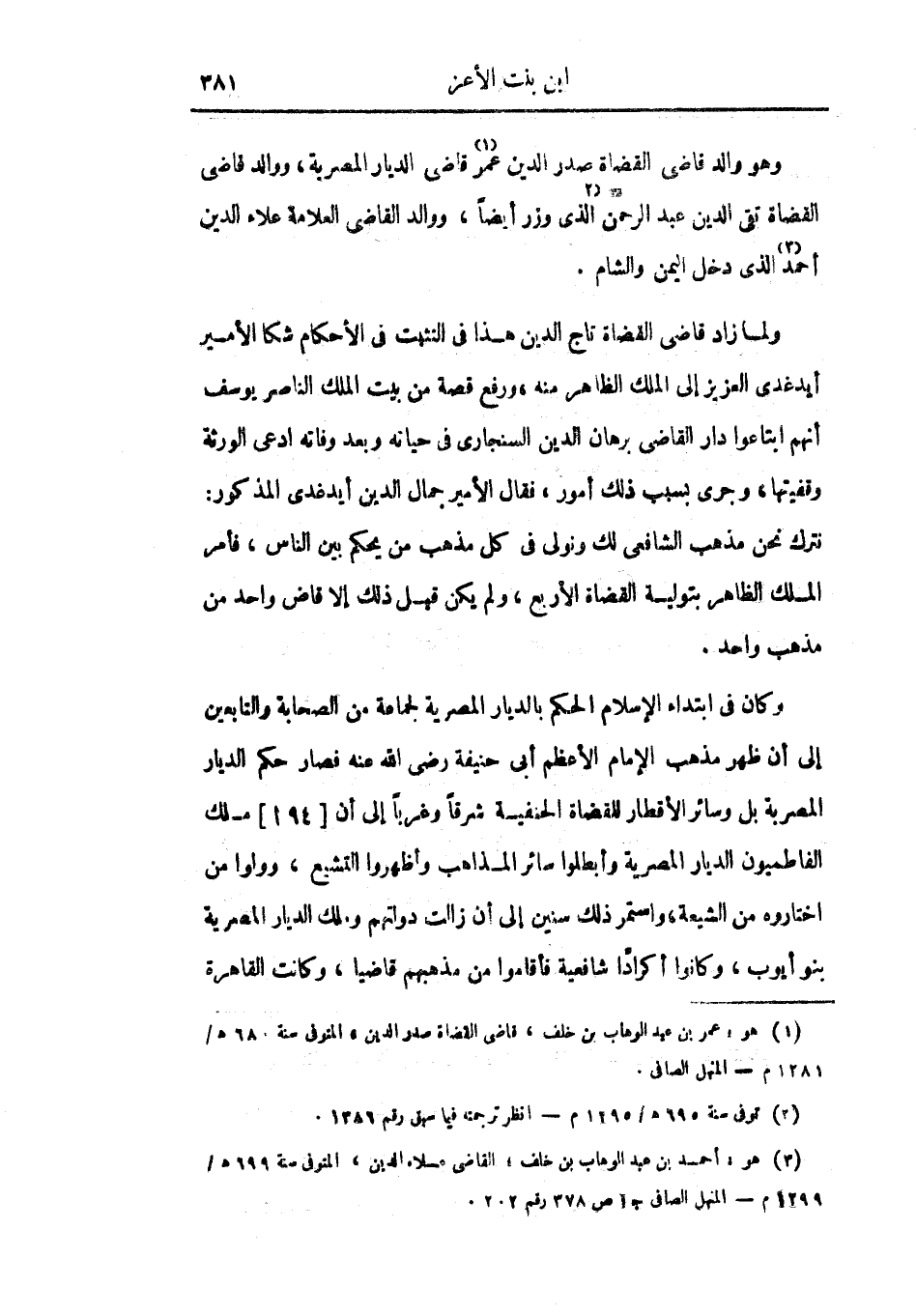 وكان في ابتداء الإسلام الحكم بالديار المصرية لجماعة من الصحابة والتابعين إلى أن ظهر مذهب الإمام الأعظم أبي حنيفة رضي الله عنه فصار حكم الديار المصرية بل وسائر الأقطار للقضاة الحنفية شرقاً وغرباً إلى أن ملك الفاطميون الديار المصرية وأبطلوا سائر المذاهب وأظهروا التشيع، وولوا من اختاروه من الشيعة، واستمر ذلك سنين إلى أن زالت دولتهم وملك الديار المصرية بنو أيوب، وكانوا أكراداً شافعية فأقاموا من مذهبهم قاضياً، وكانت القاهرة