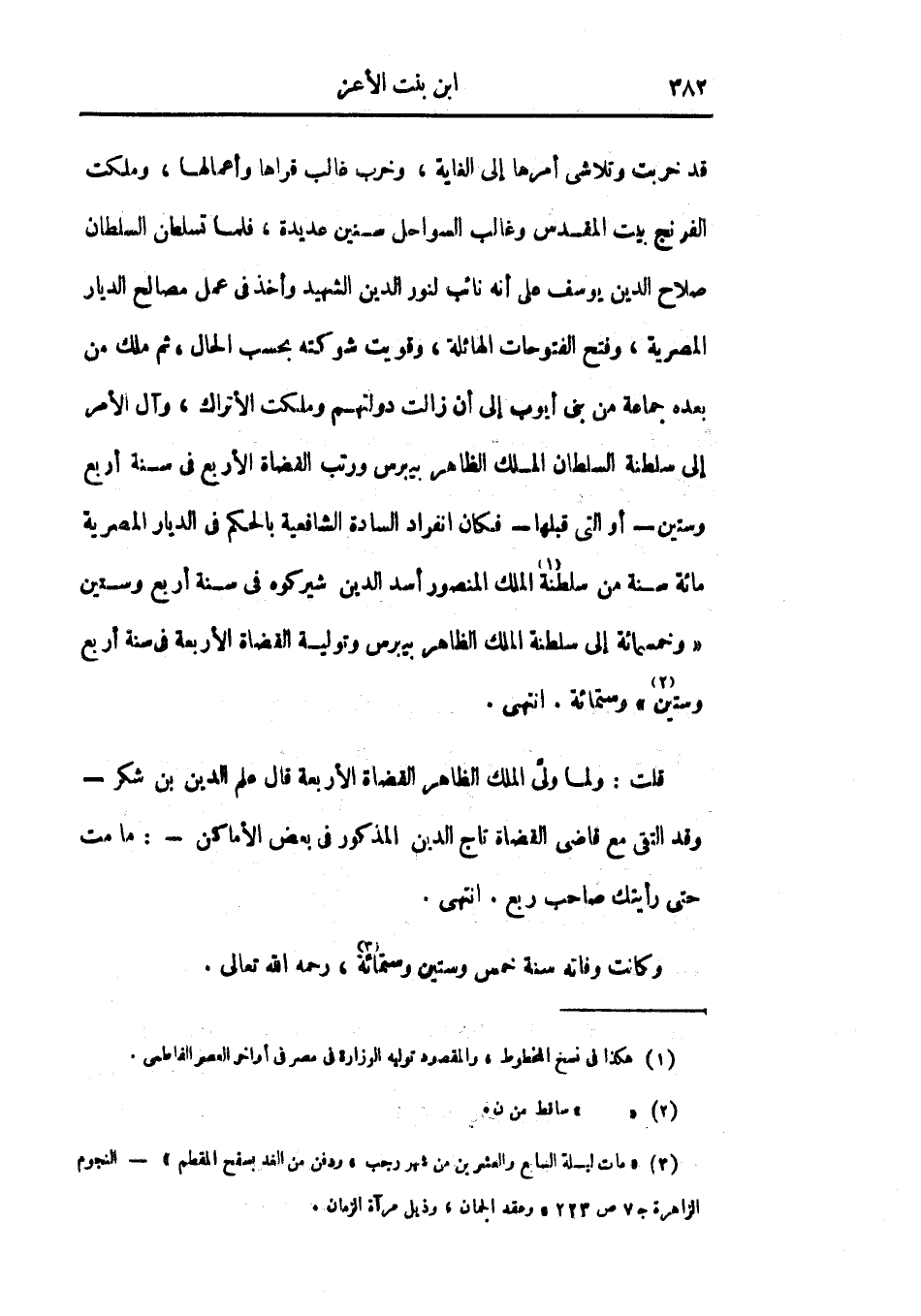 قد خربت وتلاشى أمرها إلى الغاية، وخرب غالب قراها وأعمالها، وملكت الفرنج بيت المقدس وغالب السواحل سنين عديدة، فلما تسلطن السلطان صلاح الدين يوسف على أنه نائب لنور الدين الشهيد وأخذ في عمل مصالح الديار المصرية، وفتح الفتوحات الهائلة، وقويت شوكته بحسب الحال، ثم ملك من بعده جماعة من بني أيوب إلى أن زالت دولتهم وملكت الأتراك، وآل الأمر إلى سلطنة السلطان الملك الظاهر بيبرس ورتب القضاة الأربع في سنة أربع وستين أو التي قبلها فكان انفراد السادة الشافعية بالحكم في الديار المصرية مائة سنة من سلطنة الملك المنصور أسد الدين شيركوه في سنة أربع وستين وخمسمائة إلى سلطنة الملك الظاهر بيبرس وتولية القضاة الأربعة في سنة أربع وستين وستمائة. انتهى.