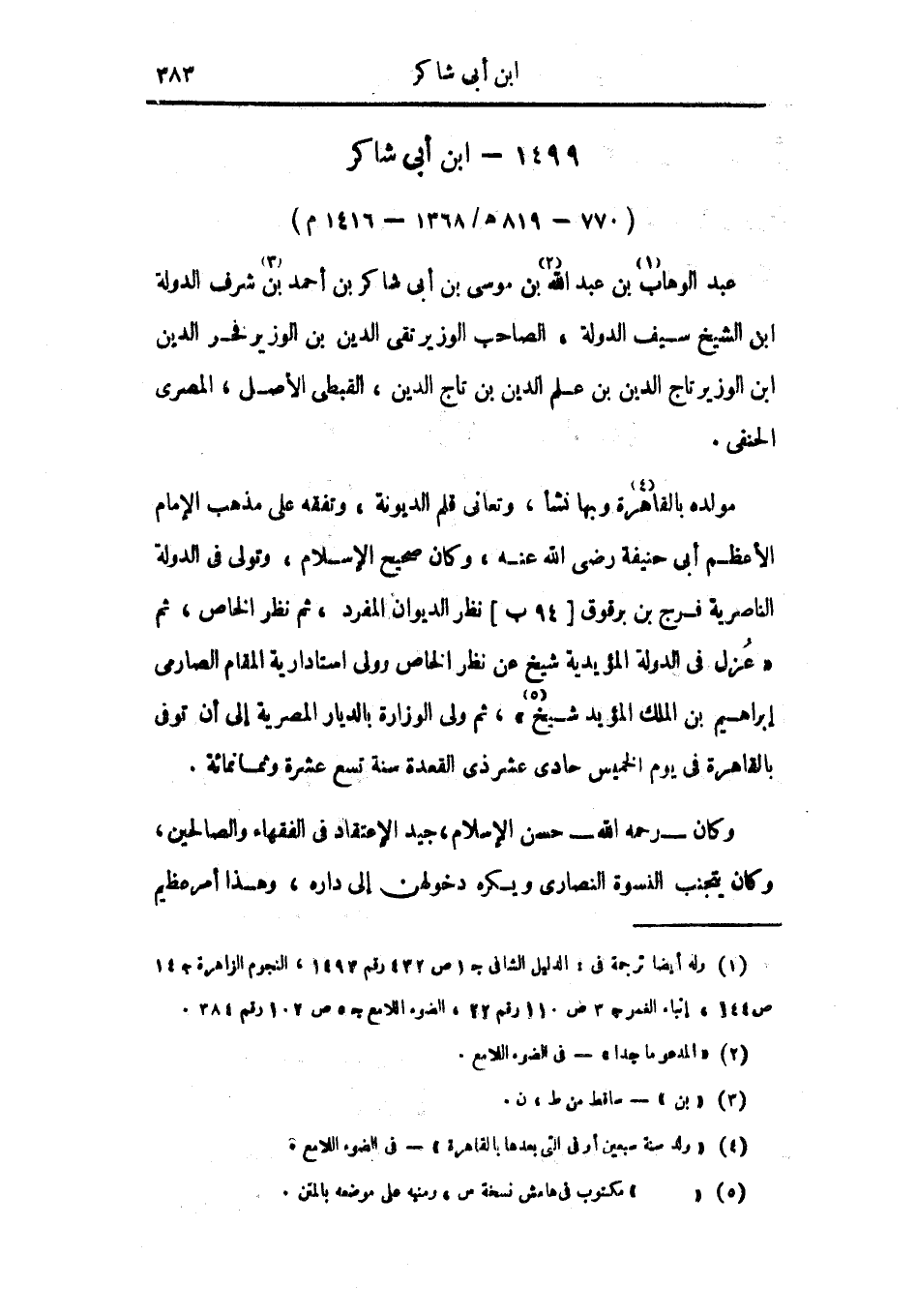 مولده بالقاهرة وبها نشأ، وتعالى قلم الديونة، وتفقه على مذهب الإمام الأعظم أبي حنيفة رضي الله عنه، وكان صحيح الإسلام، وتولى في الدولة الناصرية فرج بن برقوق نظر الديوان المفرد، ثم نظر الخاص، ثم عزل في الدولة المؤيدة شيخ عن نظر الخاص وولي أستادارية المقام الصارمي إبراهيم بن الملك المؤيد شيخ، ثم ولي الوزارة بالديار المصرية إلى أن توفي بالقاهرة في يوم الخميس حادي عشر ذي القعدة سنة تسع عشرة وثمانمائة.