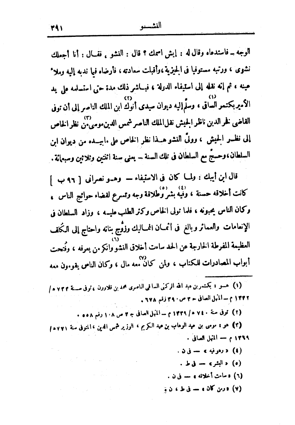 الوجه فاستدعاه وقال له: إيش اسمك؟ قال: النشو، فقال: أنا أجعلك نشوى، ورتبه مستوفياً في الجيزة، وأقبلت سعادته، فأرضاه فيما ندبه إليه وملأ عينه، ثم إنه نقله إلى استيفاء الدولة، فباشر ذلك مدة حتى استسلمه على يد الأمير بكتمر الساقي، وسلم إليه ديوان سيدي أنوك ابن الملك الناصر إلى أن توفي القاضي فخر الدين ناظر الجيش نقل الملك الناصر شمس الدين موسى من نظر الخاص إلى نظر الجيش، وولي النشو هذا نظر الخاص على ما بيده من ديوان ابن السلطان، وحج مع السلطان في تلك السنة يعني سنة اثنتين وثلاثين وسبعمائة.